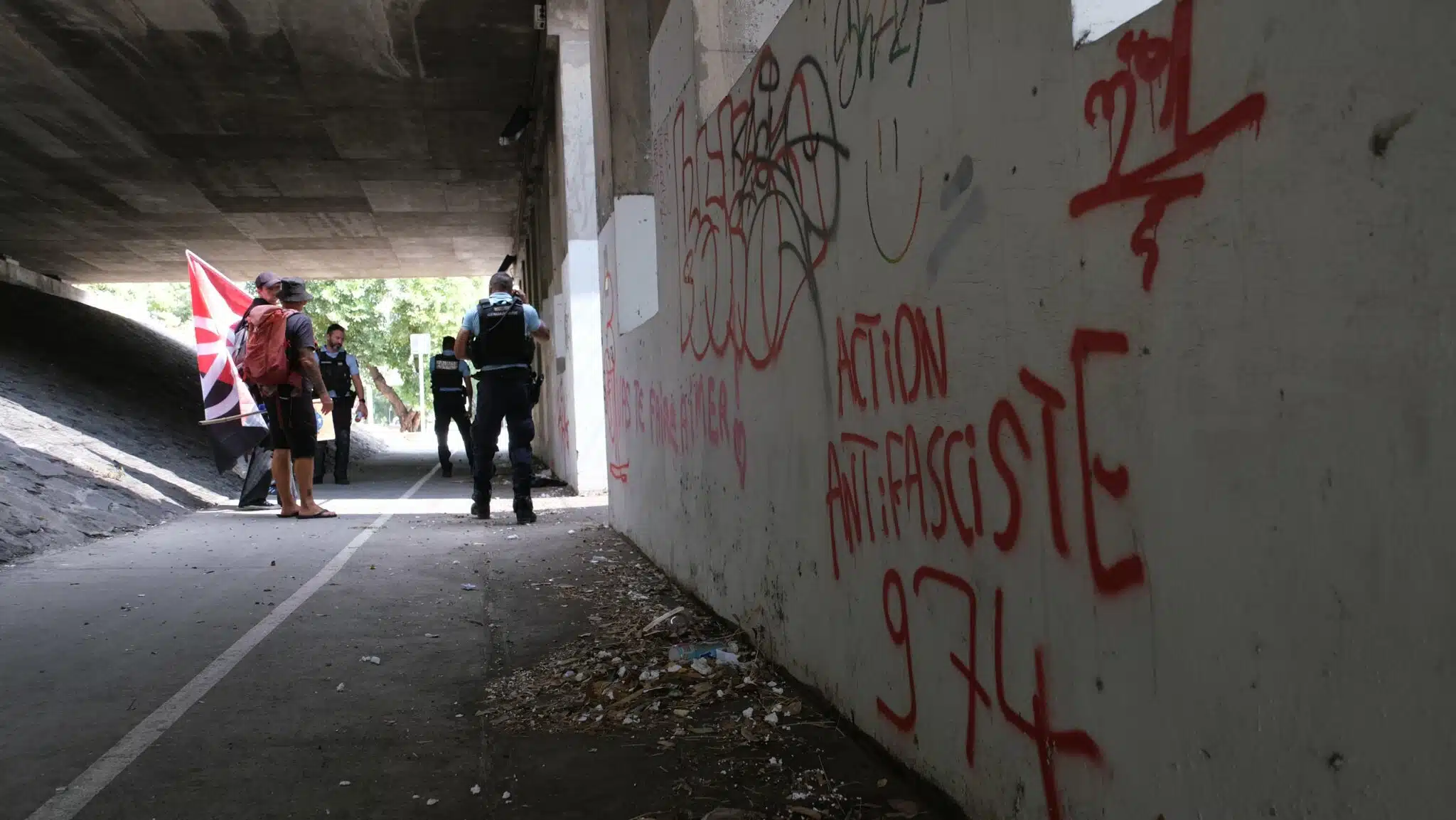 Quand même à Saint-Paul, cette scène cocasse : « Ce qui m’embête, c’est que c’est mon père qui est de droite qui va venir me chercher à la gendarmerie. » Le tout jeune homme, 16 ans à peine, un T-shirt peint « Antifasciste » dans le dos au dessus du chiffre« 1312 » vient de se faire interpeller sous le pont de Savanna pour avoir taggé en lettres rouges des slogans antifascistes.