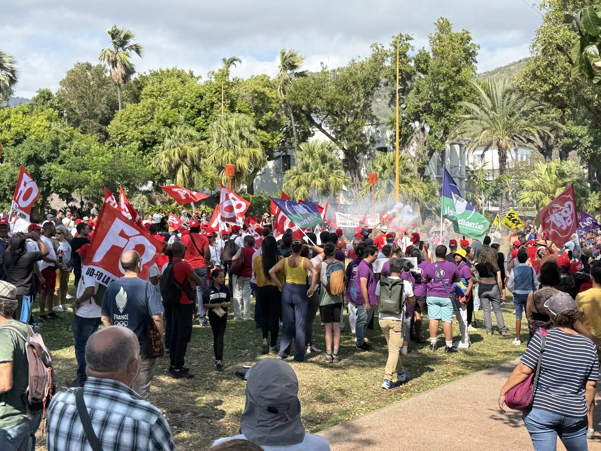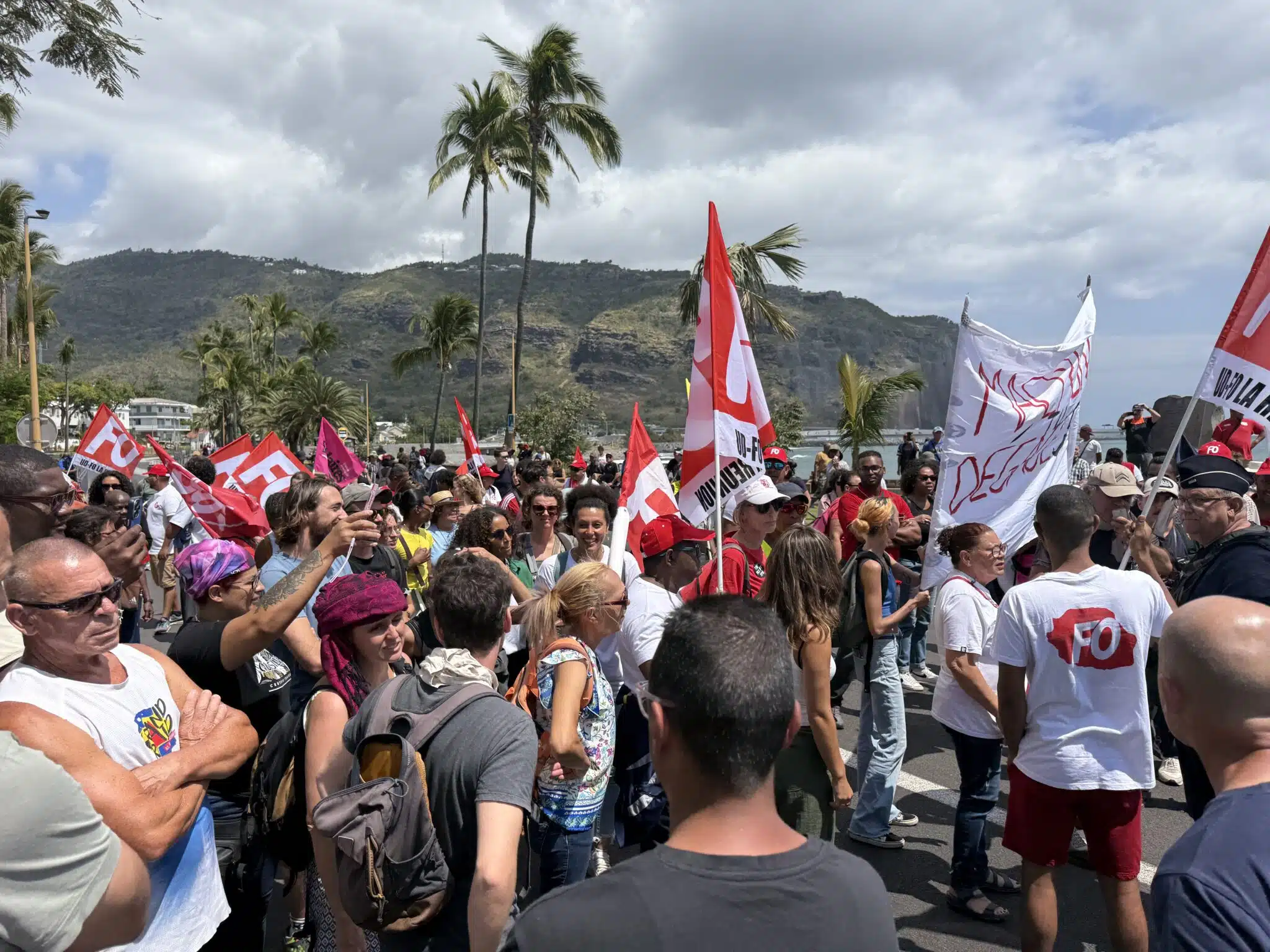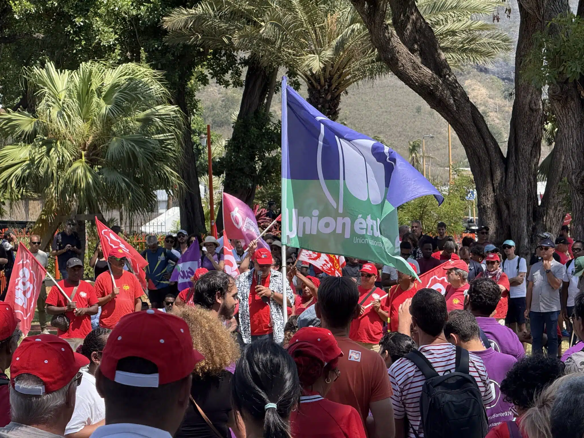 À Saint-Denis, le plus gros rassemblement comptait 400 personnes devant la préfecture. Une vingtaine d’entre elles ont pris la parole pendant deux bonnes heures. Étaient notamment présentes la CGTR emmenée par Jacky Balmine, la FSU, l’Union étudiante 974, ainsi que des figures politiques comme Huguette Bello ou Jean-Hugues Ratenon. A la fin les manifestants se sont rendus au Barachois.