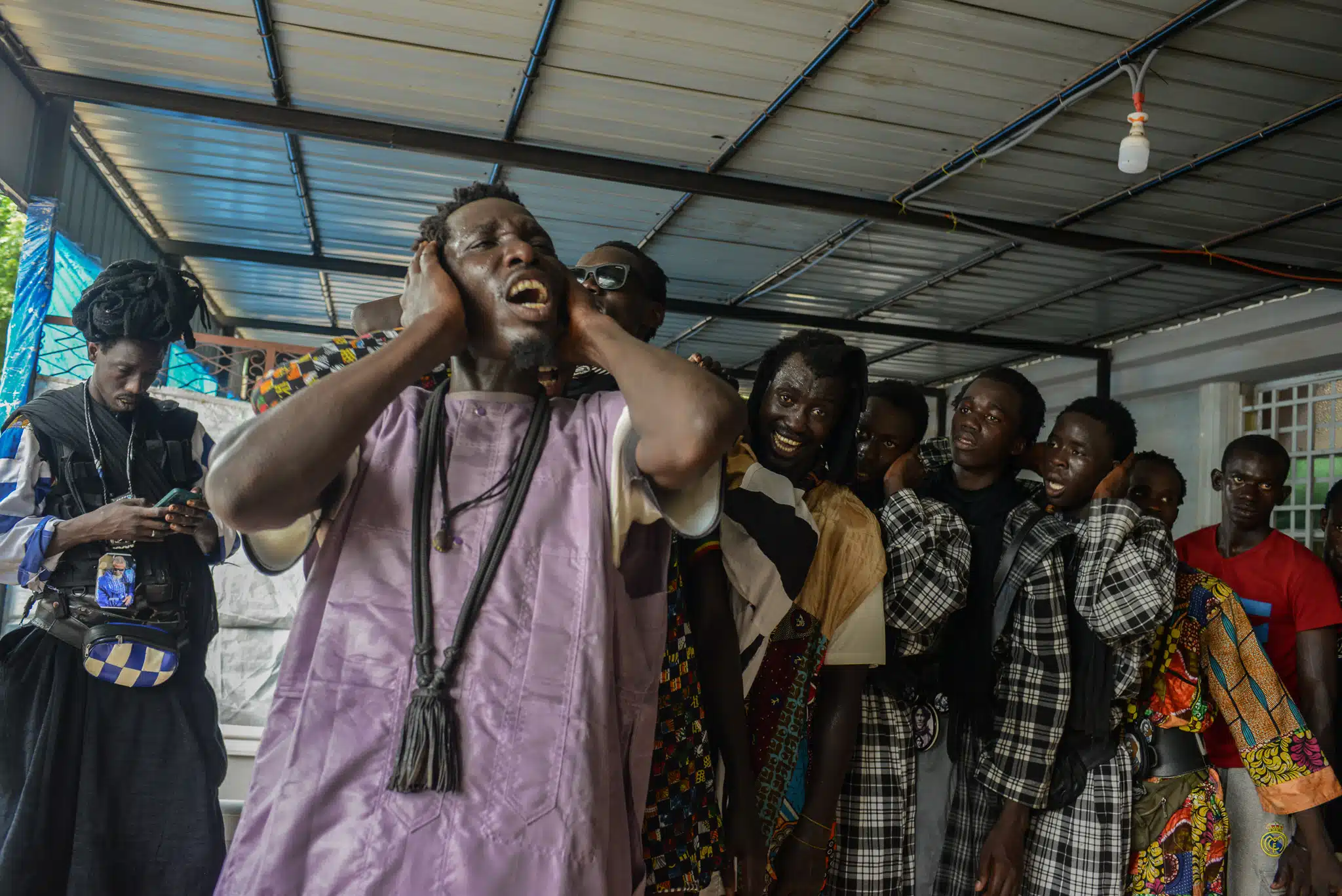 Ce jour-là, la communauté prépare le Majal, une déambulation dans les rues pour collecter des dons destinés à la préparation du Magal de Touba qui se déroulera entre Sarcelles et Aulnay-sous-Bois. L’attente s’étire, mais chacun s’occupe : on discute, on teste les tambours, on raconte des souvenirs. Babacar explique que ces moments sont essentiels : « Ici, c’est la galère », répète-t-il. Des rires fusent, tous sont d’accord avec lui.