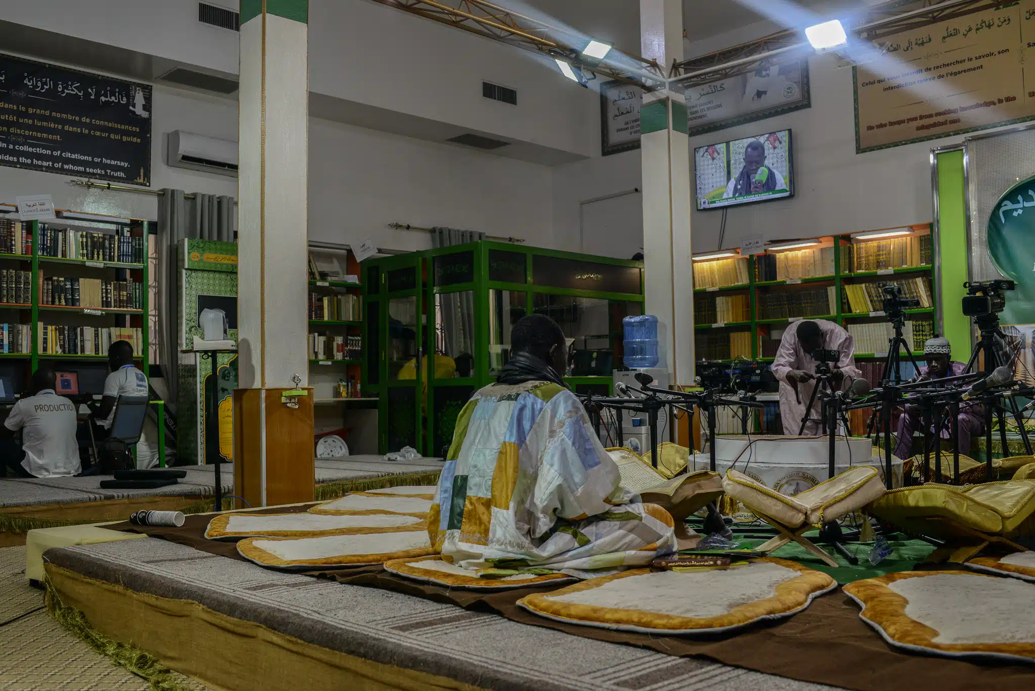 Pour répondre aux défis du 21e siècle, les mourides ont créé leur propre chaine de télévision retransmise via les plateforme telle que Youtube. Ici, une lecture d'un passage du Coran dans le batiment du Daaray Kamil. © Olivier Ceccaldi