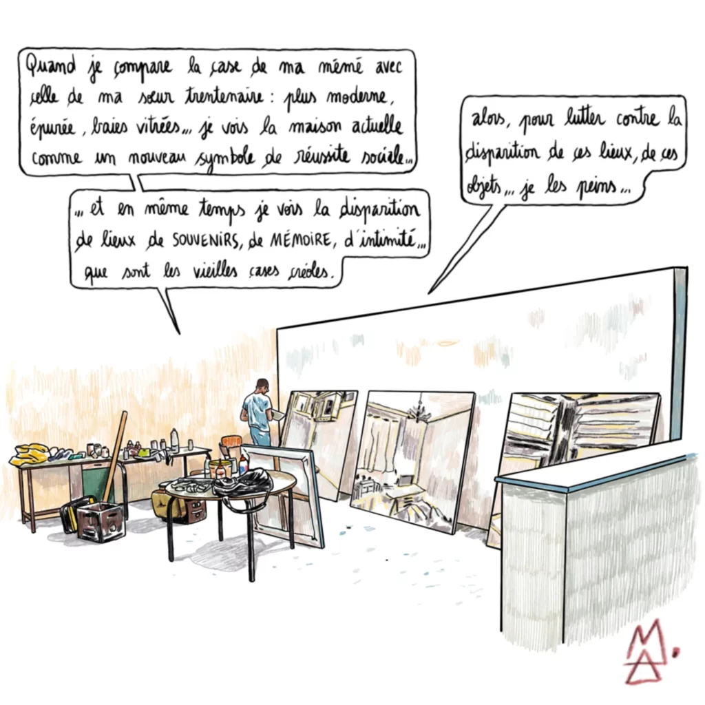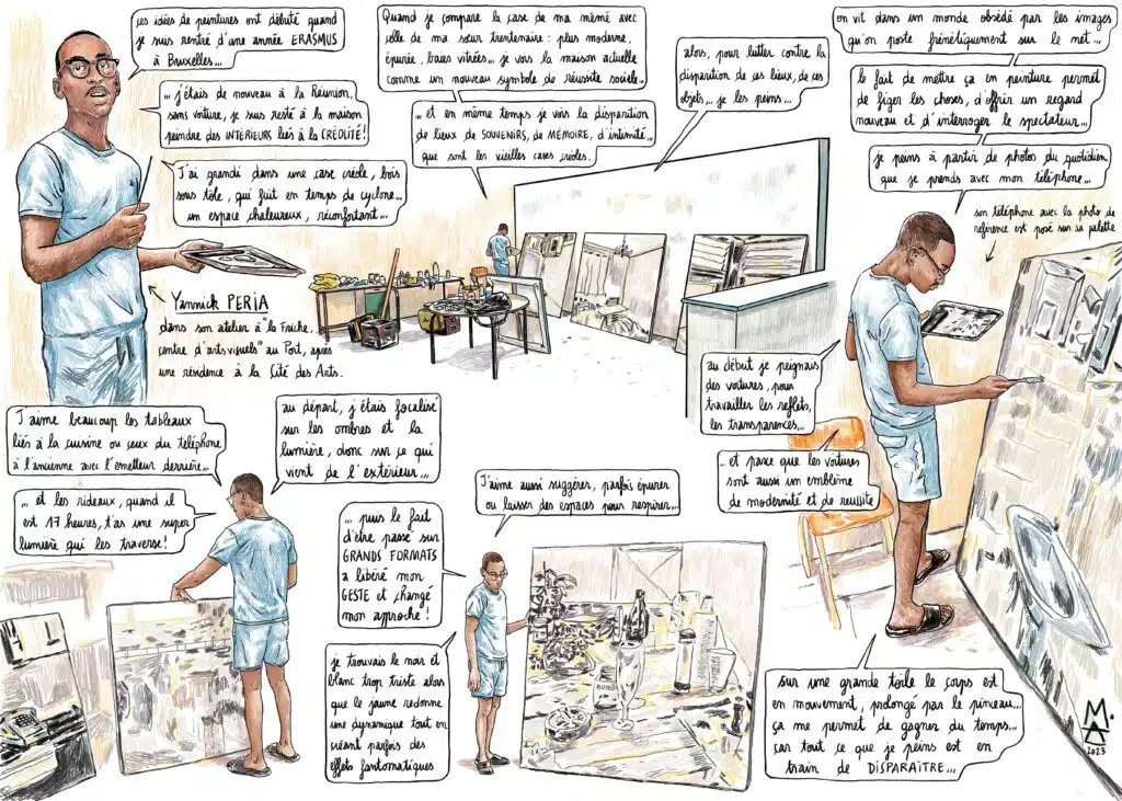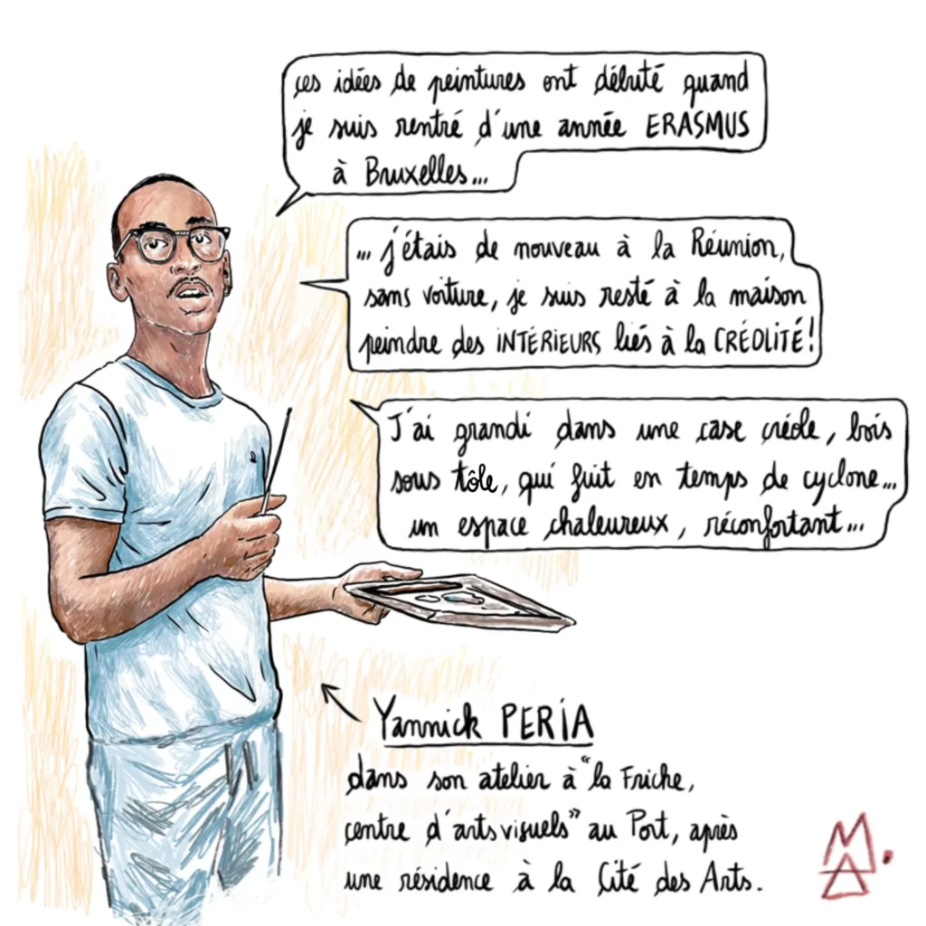 Cette semaine, Alex M propose un reportage dessiné sur le travail de Yannick Peria, dont les peintures s’intéressent à la kour, à ces lieux comme les vieilles cases créoles où les liens se tissent, les traditions s’enseignent, la mémoire perdure…