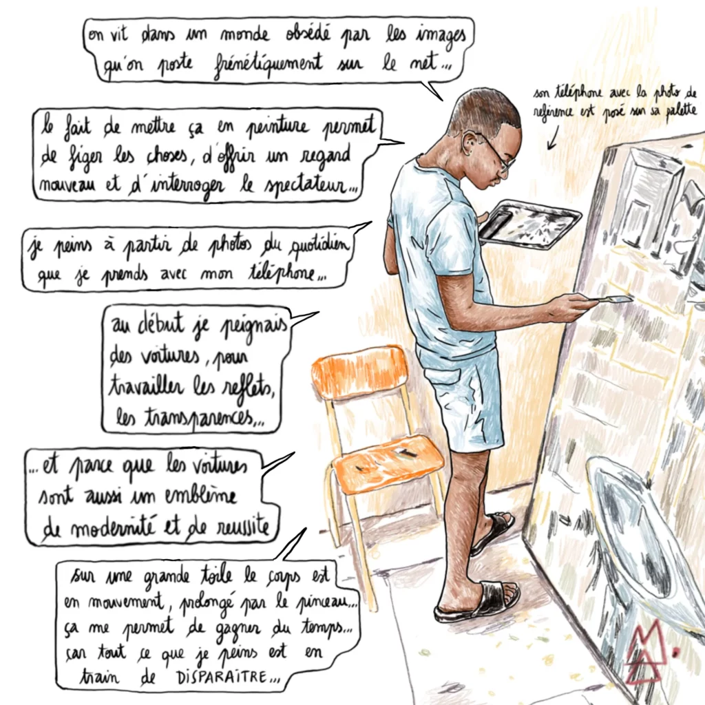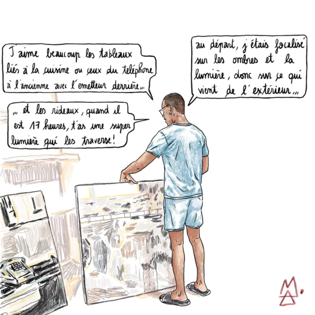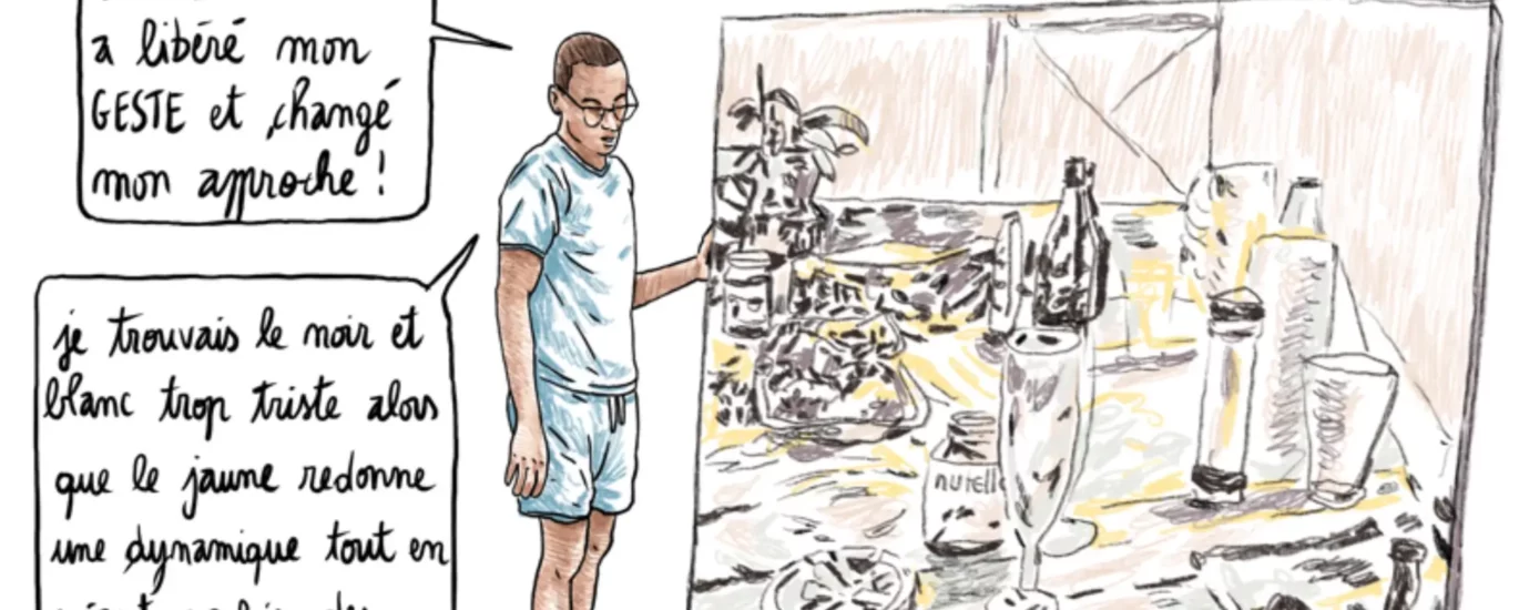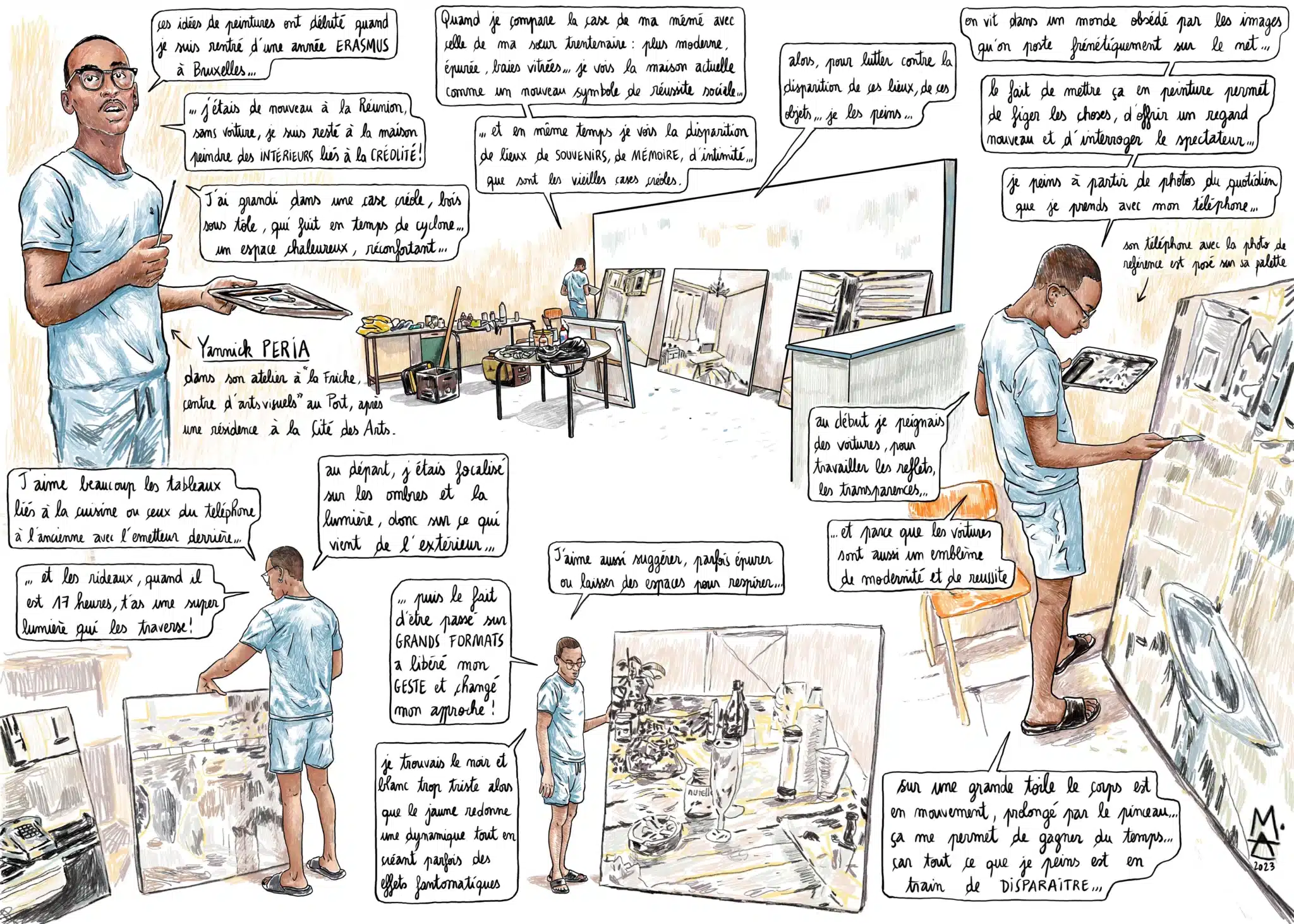 Cette semaine, Alex M propose un reportage dessiné sur le travail de Yannick Peria, dont les peintures s’intéressent à la kour, à ces lieux comme les vieilles cases créoles où les liens se tissent, les traditions s’enseignent, la mémoire perdure…