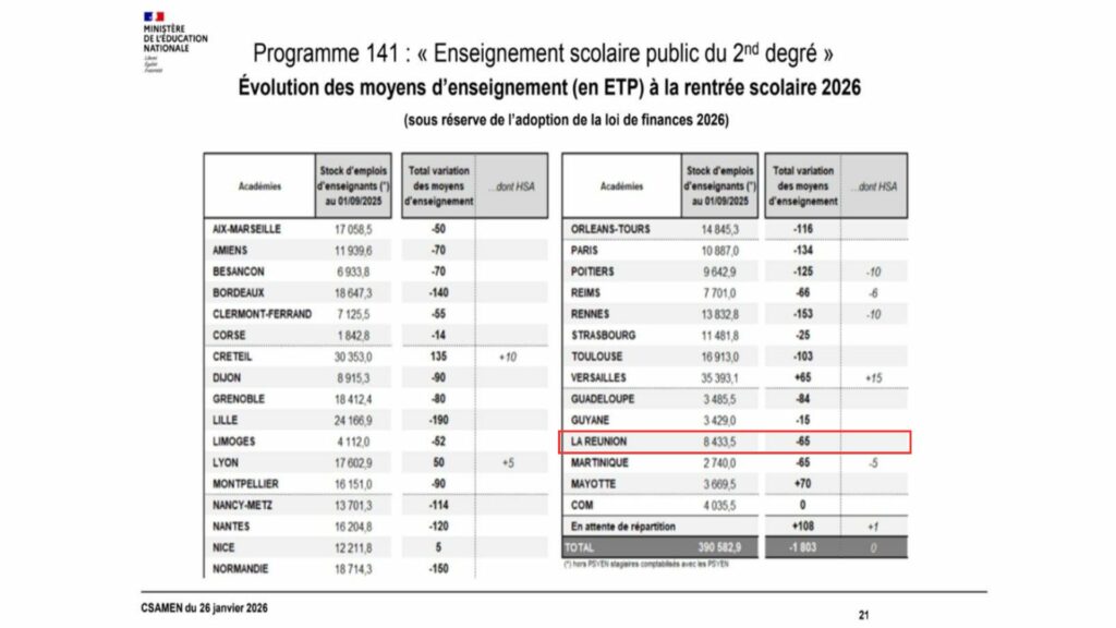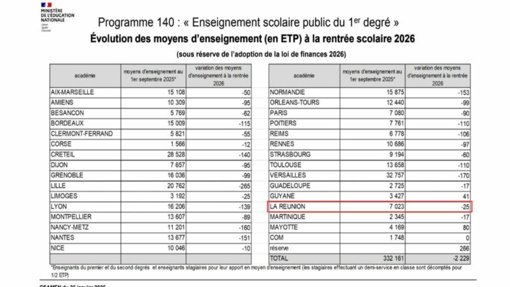 « Il va y avoir un comité social d’administration (CSA) académique le 5 Février. À la suite de cette réunion avec les représentants des syndicats, Monsieur le Recteur prendra la parole. » C’est ce que le rectorat a déclaré récemment suite à l’annonce jugée « inacceptable » par le parti PLR (Pour La Réunion) de supprimer 90 postes d’enseignants sur l’île. Cette nouvelle arrive dans le cadre de la préparation du budget de l’État et de la présentation des moyens humains lors du Comité social d’administration ministériel (CSAMEN) de janvier 2026. L’objectif de cette action est de contribuer à un effort global pour réduire les dépenses publiques, et serait également justifié sur le plan national par la baisse de la croissance démographique et donc une diminution des effectifs scolaires.