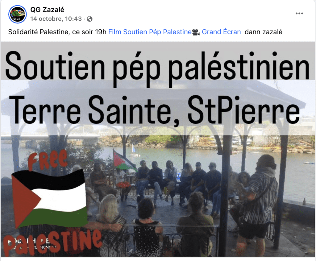RASSEMBLEMENT INTERDIT À TERRE-SAINTE Le samedi 14 octobre, une vingtaine de personnes se sont réunies sous un kiosque, à Saint-Pierre, pour parler et montrer leur soutien au peuple palestinien. L’invitation avait été relayée deux jours plus tôt par la page FaceBook du QG Zazalé. Et interdite la veille par un arrêté préfectoral particulièrement choquant. On a rarement fait plus dans […]