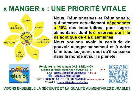 Pour répondre à cette légitime et sage exigence, le mouvement Oasis Reunion lance ce 7 mars 2023 une très forte campagne de communication : « MANGER, UNE PRIORITÉ VITALE ». Cette campagne s’adresse de façon non « dogmatique » aux gouvernants, aux pouvoirs publics, aux organisations professionnelles agricoles, avec le soutien de plusieurs dizaines de milliers de citoyens consommateurs.