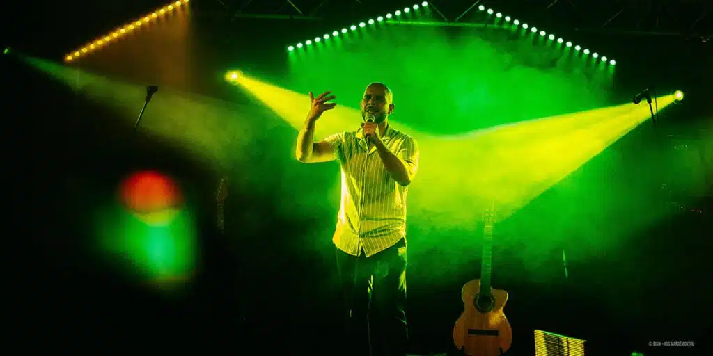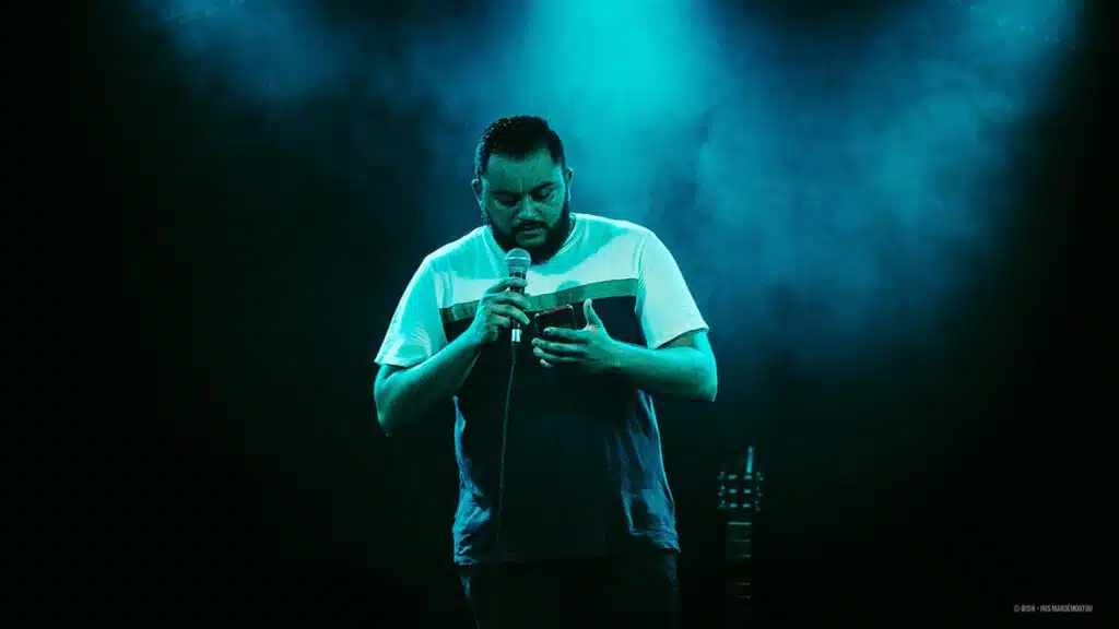 Dann (K)ozé néna lo mo sou tout form. Rasta li la ni zoué ek lo mo pou fé rir la boush é romét sourir bor la lév in piblik an or. Apél ali « stand-up » apél ali kasaz lé kui. Dann (K)ozé napwin triaz tou lo lé bon à prann.