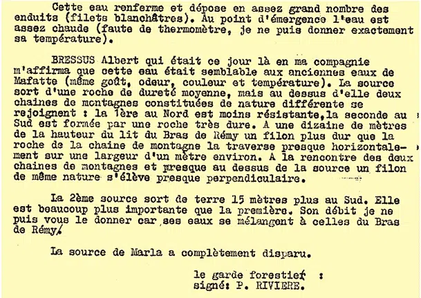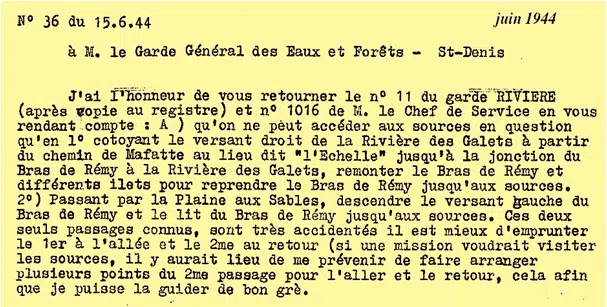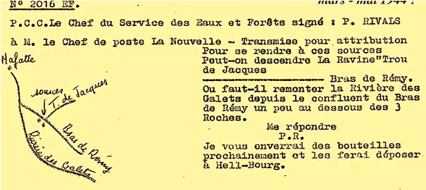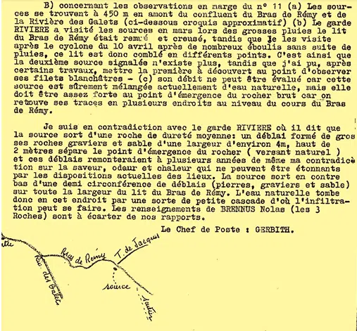 Selon le second extrait rédigé par le chef de poste Gerbith, on peut juger de l’instabilité du terrain. Tout a changé depuis mars 44 et le cyclone d’avril. Après avoir décrit les accès possibles, plutôt périlleux, aux sources indiquées sur les données fournies par le garde Rivière, le chef Gerbith ne retrouve pas vraiment la situation décrite par son subordonné. Il estime notamment que la seconde source, la plus importante, a tout simplement disparu.