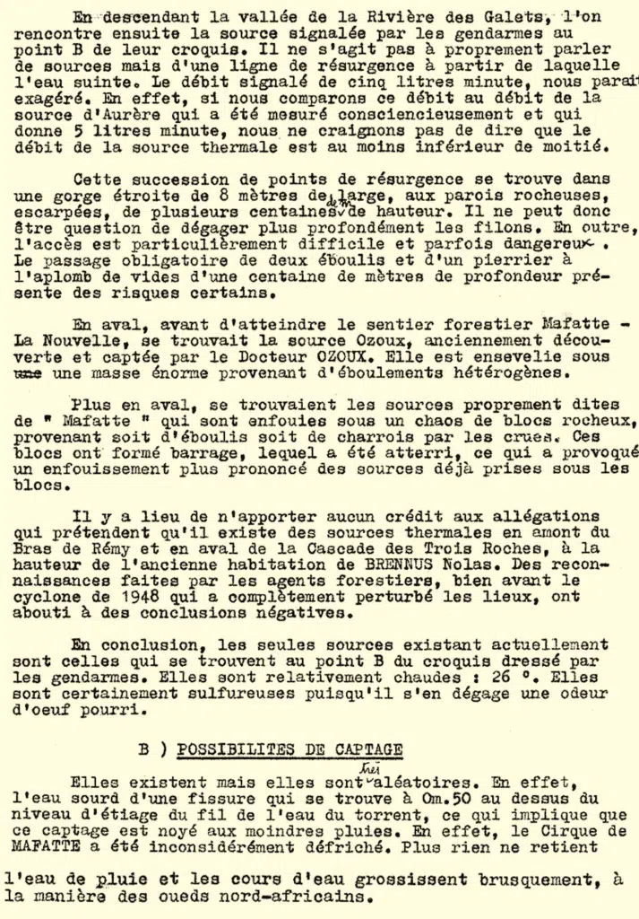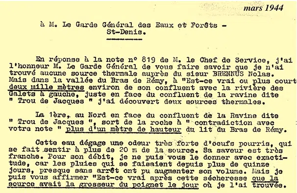 Les recherches de 1944 n’ont produit aucun résultat. 15 ans après une nouvelle reconnaissance des sources thermales est impulsée à l’initiative de la préfecture. Elle est réalisée par la compagnie de gendarmerie de Saint-Denis. Mais accompagnant les gendarmes, on retrouve le guide porteur déjà connu, Marcel Thiburce, le fameux Marcellin de Grand Place, âgé à l’époque d’environ 45 ans, « cantonnier des Ponts et Chaussées et qui deviendra l’aubergiste et l’homme à tout faire de Grand Place ». Le document suivant n’est qu’une copie..