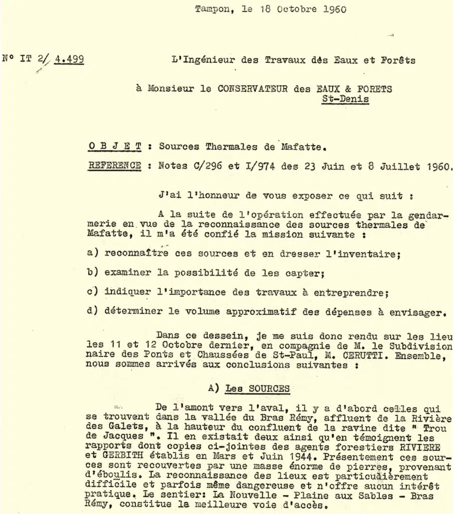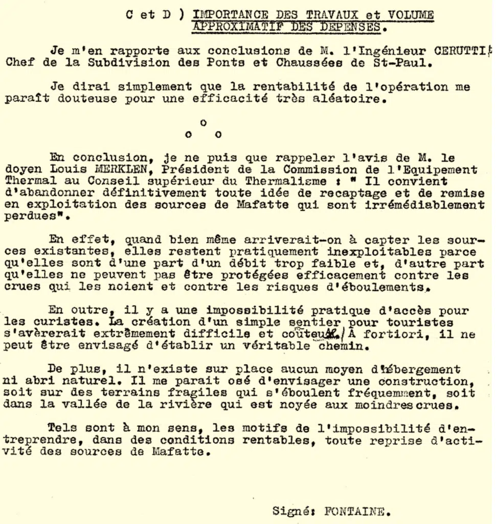 Son rapport dissuasif signera pour cette année là en tout cas la fin de l’espoir d’une restauration des cures thermales de Mafate…