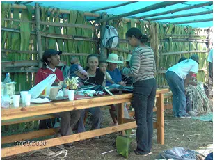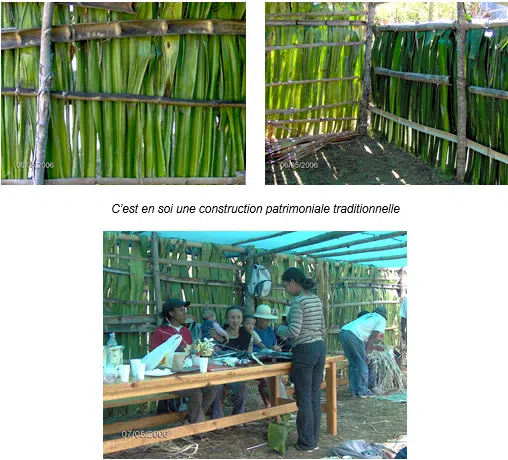 Il n’est pas indifférent de savoir que les trois jours d’atelier se déroulent « dans » la salle verte, confectionnée selon leur tradition par les habitants, en décembre 2005 à l’intention de la rencontre de travail du Comité Mafate. Amarré aux poteaux de bois ou de bambou, le matériau des parois, c’est du choka ou kader – Furcraea foetida, de la famille des agaves.