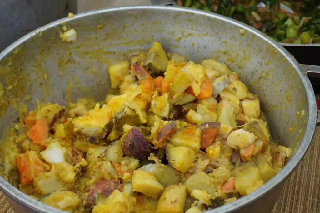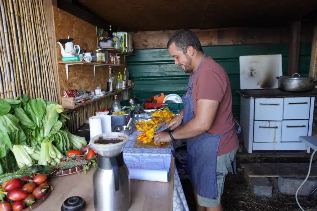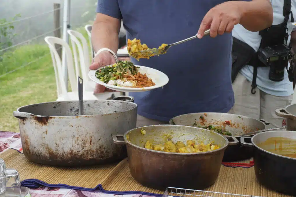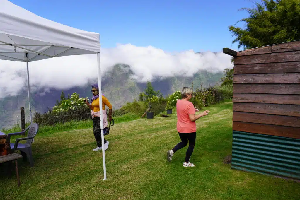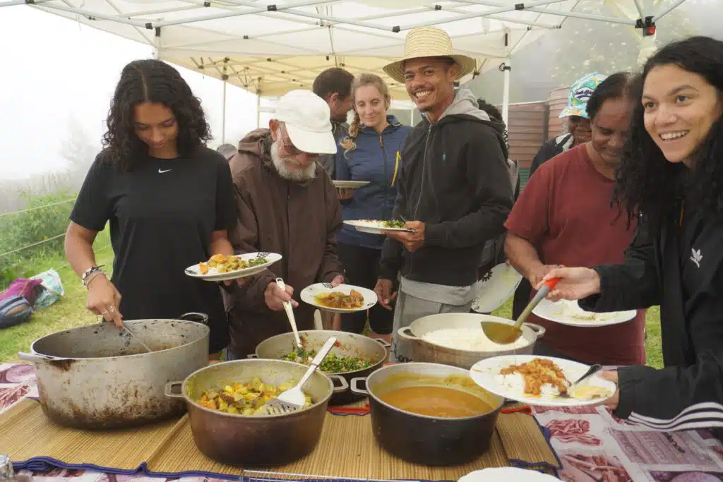 La visite terminée, le groupe se rassemble sous les chapiteaux pour un copieux repas traditionnel cuisiné au feu de bois par Gabriel Bénard. Le troisième ami de la bande les a rejoints il y a un an. Amis de longue date, ils jouaient déjà ensemble dans le même groupe de musique de maloya. Au menu : apéritif avec beignets de patate douce, houmous de gros pois. Pour l’entrée, gratin de potimarron du village, brèdes, rougail tomates arbustes et enfin un cari de légumes et un cari poulet pour le plat principal. Complété par un gâteau ti son au chocolat pour le dessert. Heureusement que la petite marche en fin de journée permet de faire digérer.