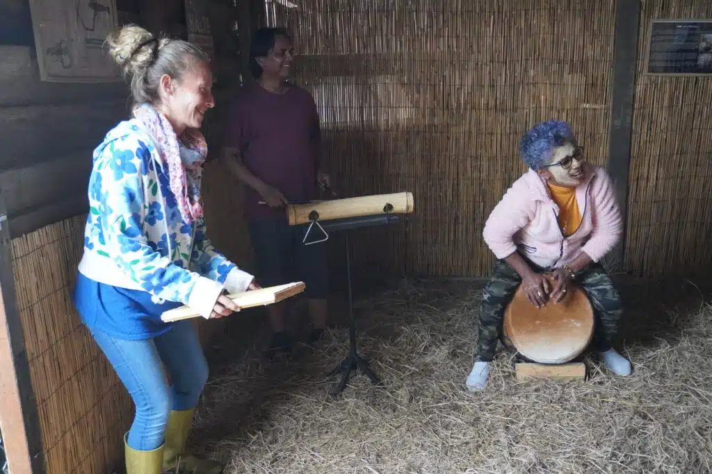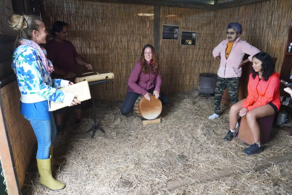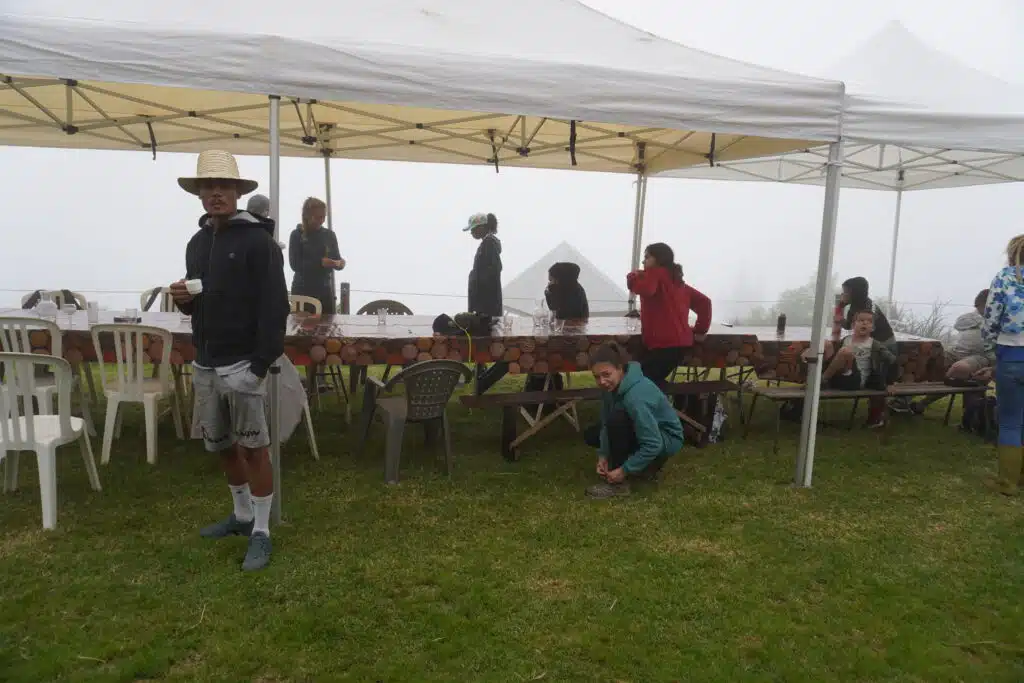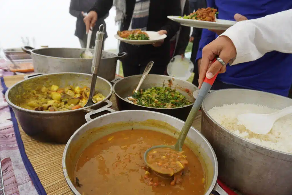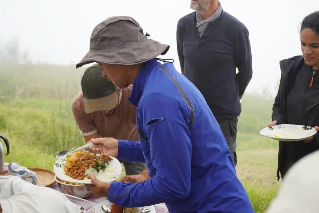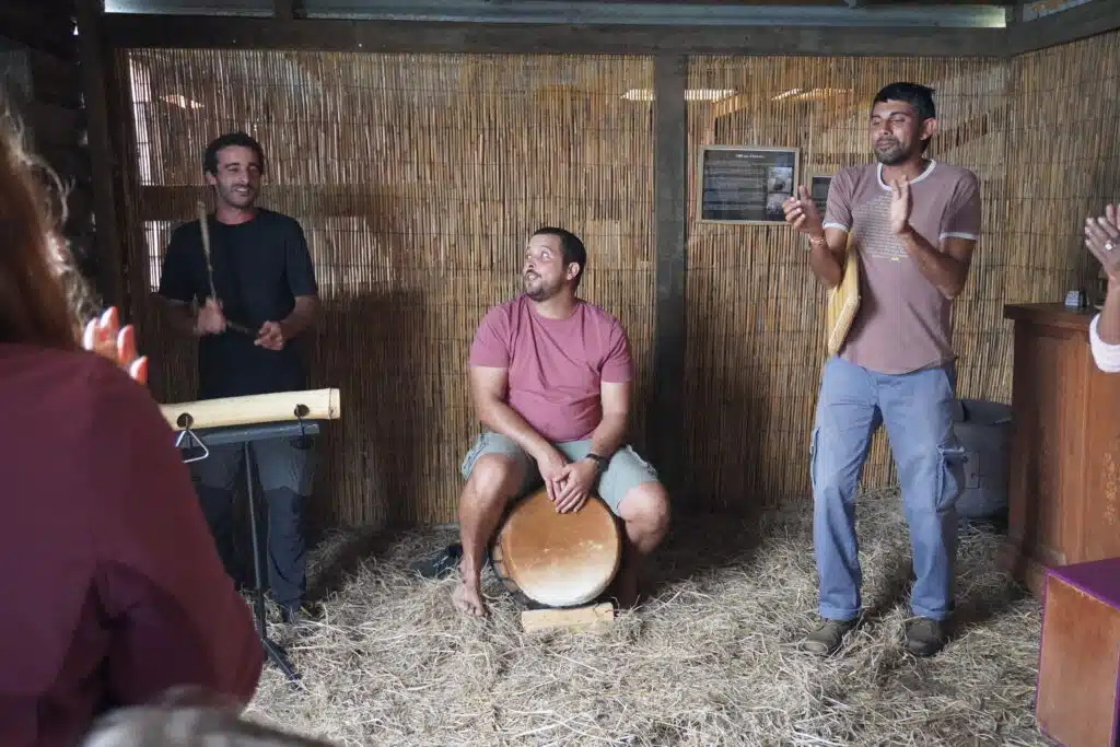 La visite terminée, le groupe se rassemble sous les chapiteaux pour un copieux repas traditionnel cuisiné au feu de bois par Gabriel Bénard. Le troisième ami de la bande les a rejoints il y a un an. Amis de longue date, ils jouaient déjà ensemble dans le même groupe de musique de maloya. Au menu : apéritif avec beignets de patate douce, houmous de gros pois. Pour l’entrée, gratin de potimarron du village, brèdes, rougail tomates arbustes et enfin un cari de légumes et un cari poulet pour le plat principal. Complété par un gâteau ti son au chocolat pour le dessert. Heureusement que la petite marche en fin de journée permet de faire digérer.