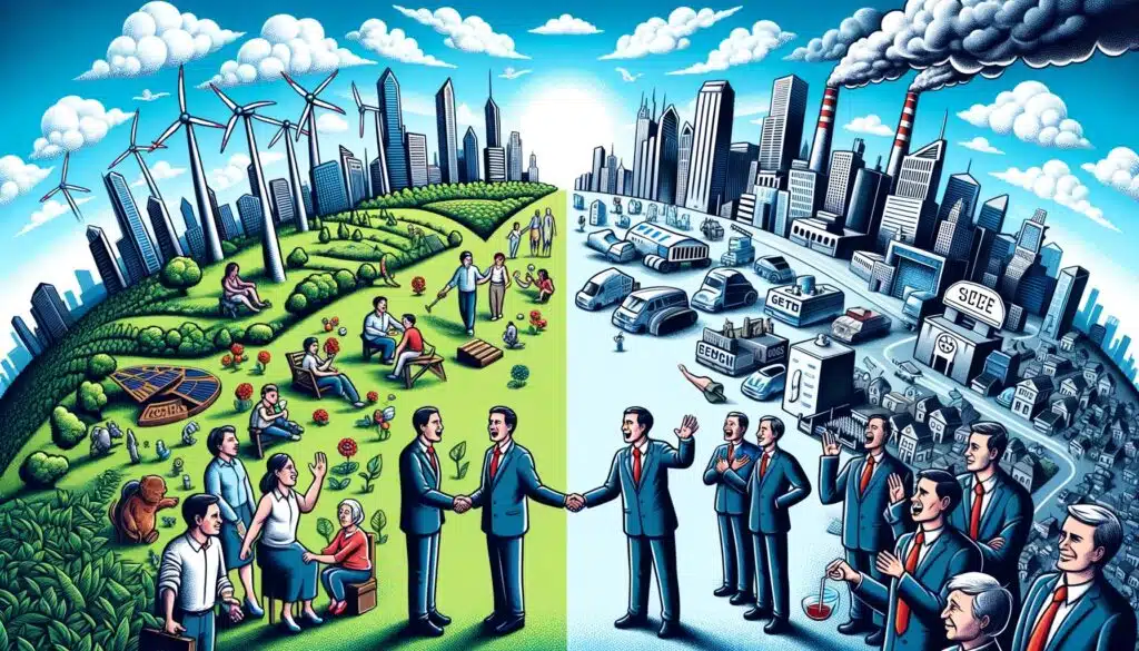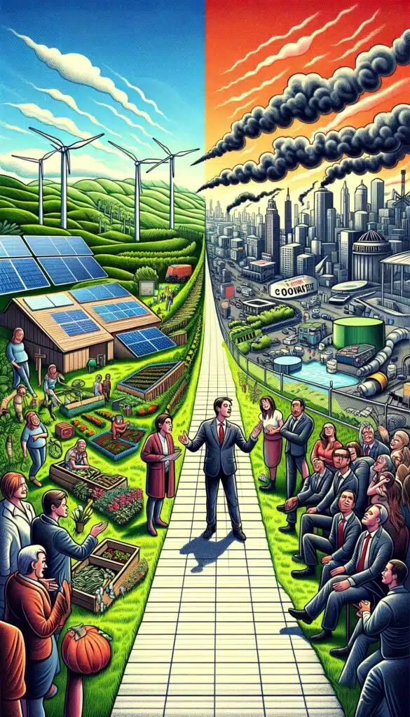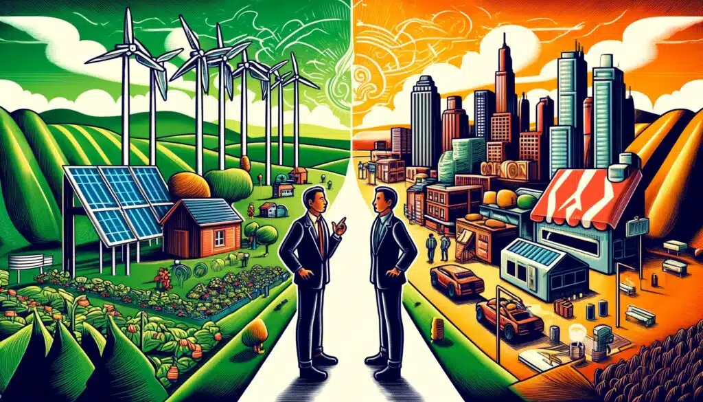 Voici une illustration représentant les deux visions politiques opposées. À gauche, la vision progressiste avec les énergies renouvelables et la solidarité sociale. À droite, la vision conservatrice mettant en avant la croissance économique et l’innovation. Les deux politiciens débattent vivement, chacun défendant ses idées avec passion.
