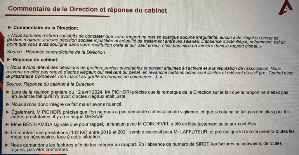 La lecture des échanges montre que la direction de Soliha a beaucoup insisté sur les termes pour faire la différence entre « illégal » et « illicite » : « Nous avons relevé des décisions de gestion, parfois discutables et portant atteinte à l’activité et a la réputation de l’association. Nous n’avons en effet pas relevé d’actes illégaux qui relèvent du pénal, en revanche certains actes sont illicites et relèvent du civil (ex : Contrat avec le prestataire Coindevel, non inscrit au greffe du tribunal de commerce…). » a fini par répondre le cabinet d’audit.