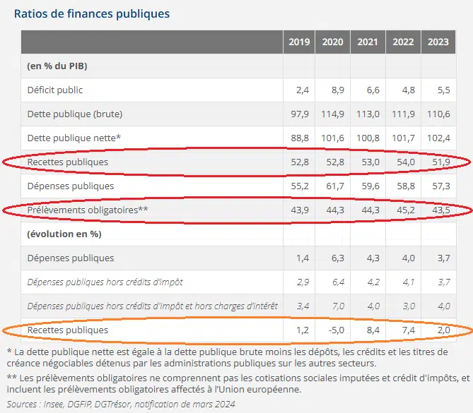 Pour les libéraux, l’axe principal est toujours de mettre en avant le niveau de dépenses. Or, d’après les chiffres de l’INSEE (Etude n° 74 du 26/03/2024), c’est bien le ratio de recettes publiques et celui des prélèvements obligatoires qui diminuent, particulièrement en tenant compte de l’inflation annuelle, et constituent donc un manque certain dans les caisses de l’Etat. Cette diminution est le reflet d’une politique de l’offre en place depuis des dizaines d’années, prolongée par le président et qui n’a pas fonctionné.