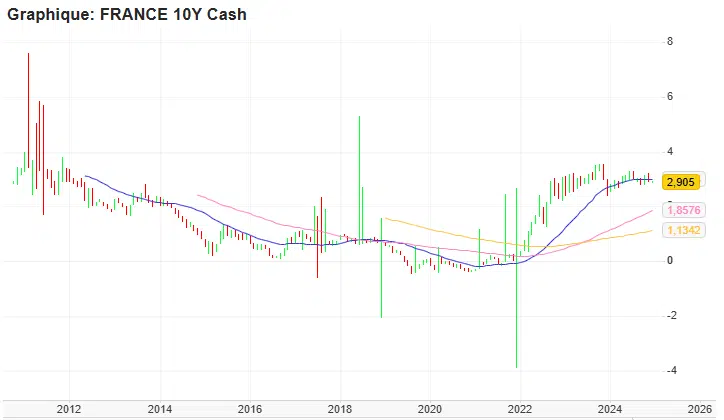 Par exemple, l’un des indices les plus scruté est le taux d’emprunt pour les titres à 10 ans (Donc un emprunt sur 10 ans). Le graphique ci-dessous montre l’évolution de ce taux depuis 2011. (Source : https://www.zonebourse.com/cours/taux-interet/FRANCE-10Y-CASH-146043504/)