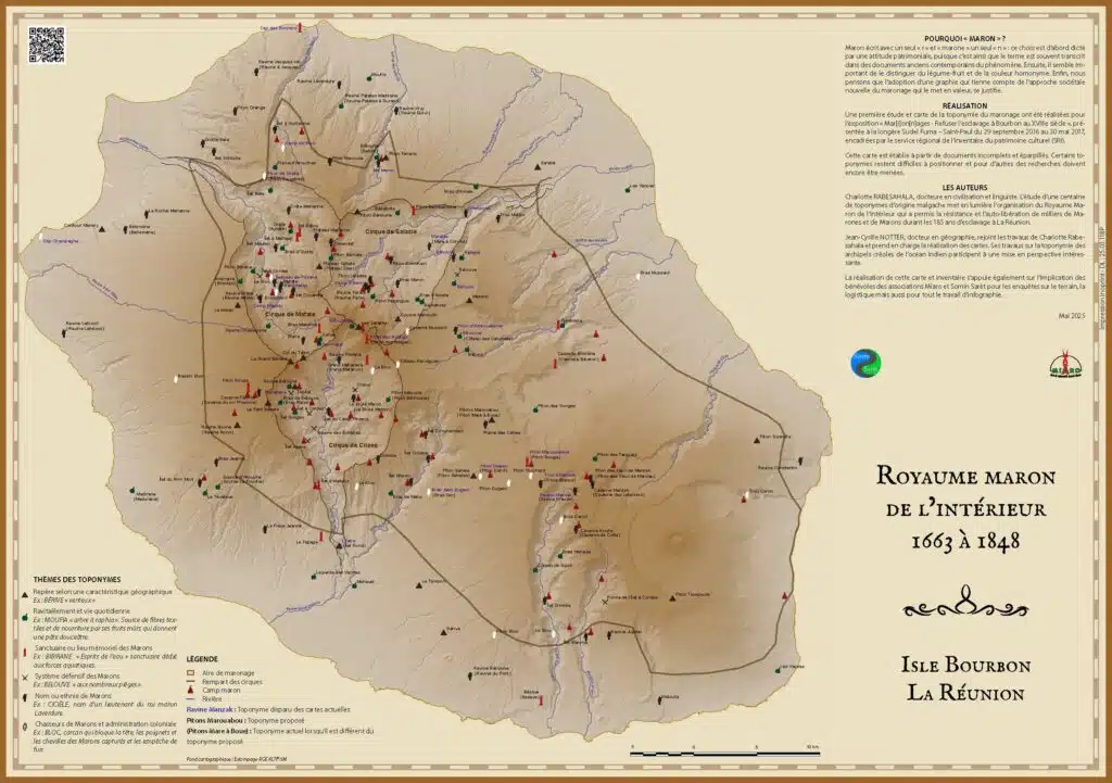 Dans la légende, on peut distinguer les « Aires de maronage », les « Remparts des cirques » ou encore les « Camps marons ». Parmi les nouveautés de cette carte, il y a l’explication résumée des toponymes, au recto, et détaillée grâce à un QR code disposé dans un coin de celle-ci.