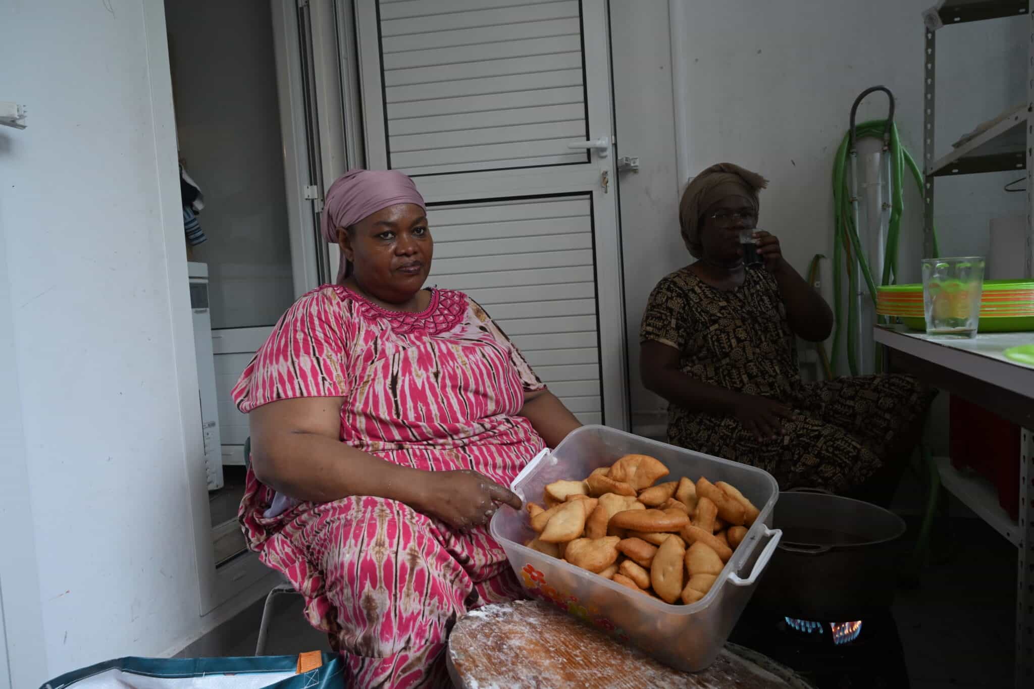 Fatima et d’autres mamans préparent les beignets pour le goûter.