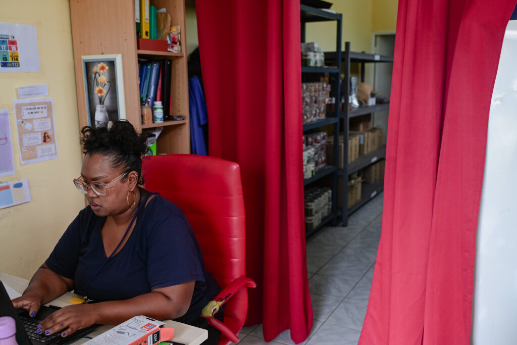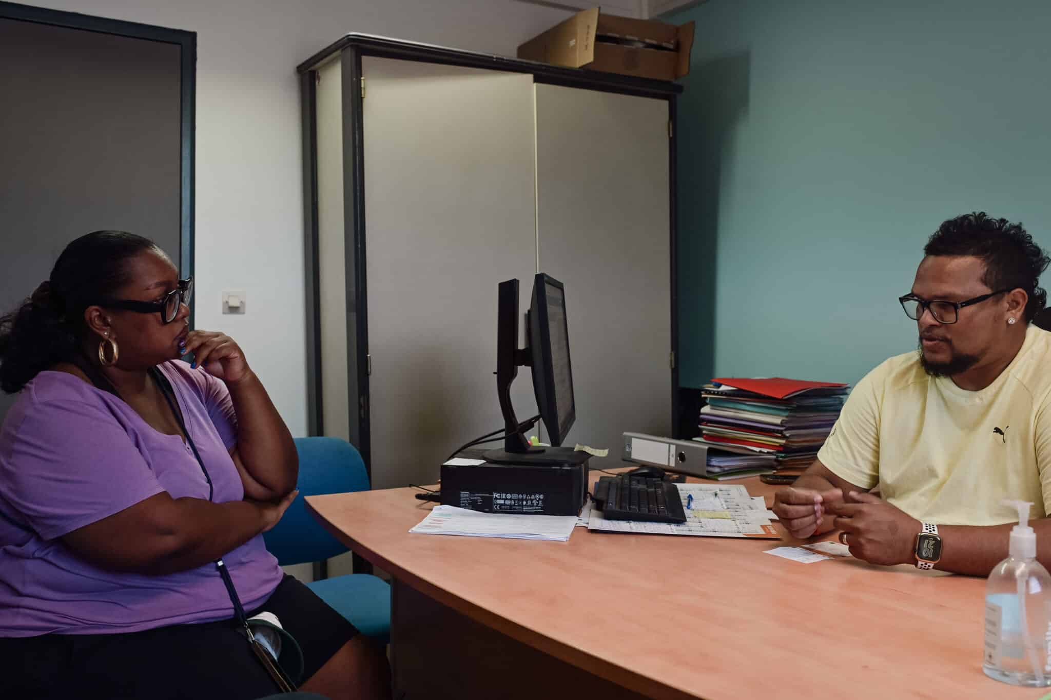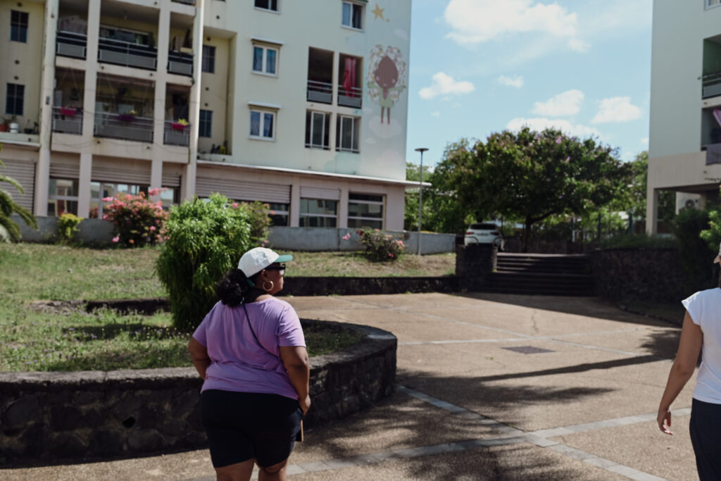 Le local est petit, niché au pied de la barre d’immeubles du bloc Vétyver. Ce lundi matin, comme chaque jour depuis le début de son contrat d’adulte relais, Alexia sillonne les quartiers de Jolifond et de Basse-Terre les Bas. Au fil des rencontres, la jeune femme présente l’association La case momon lé la, pour laquelle elle travaille, et invite les habitant·es à participer aux activités proposées.