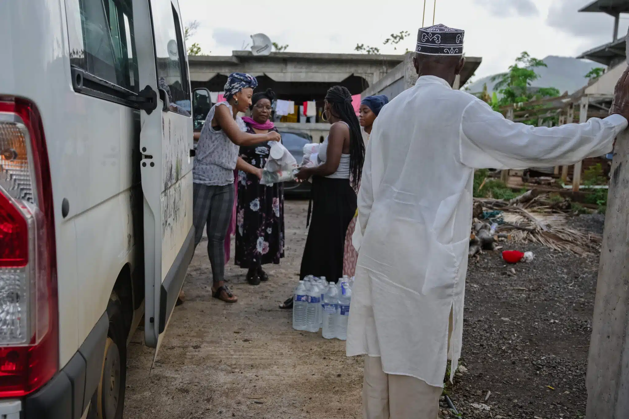 Distribution d’eau et de nourriture organisée par le CCAS de Chirongui auprès des personnes âgées dans le village de Malamani en janvier 2025.