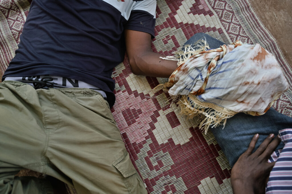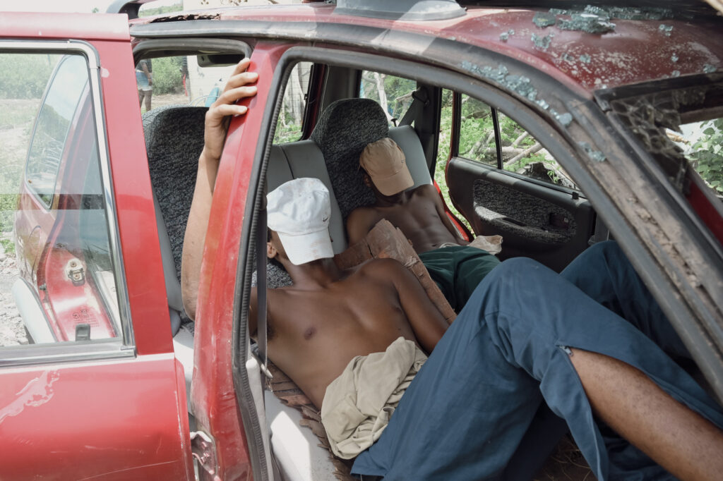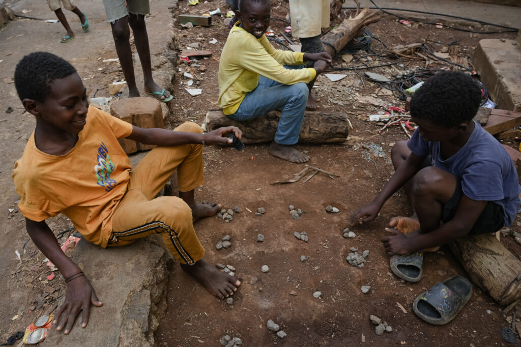 Le collège de Kwalé étant occupé par des personnes exilées, les élèves patientent en jouant avec des lance-pierres de leur fabrication ou en escaladant la structure du stade de foot.
