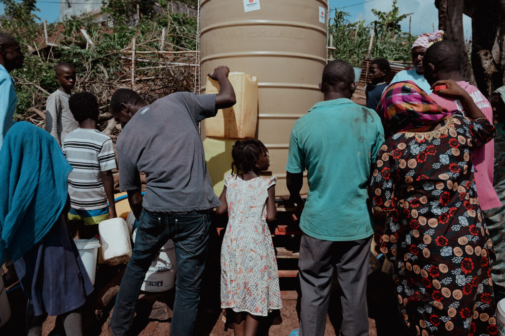 Les habitants du bidonville de Passamainty se pressent pour pouvoir profiter de l’eau potable amenée par l’ONG Solidarités International et la Croix Rouge.