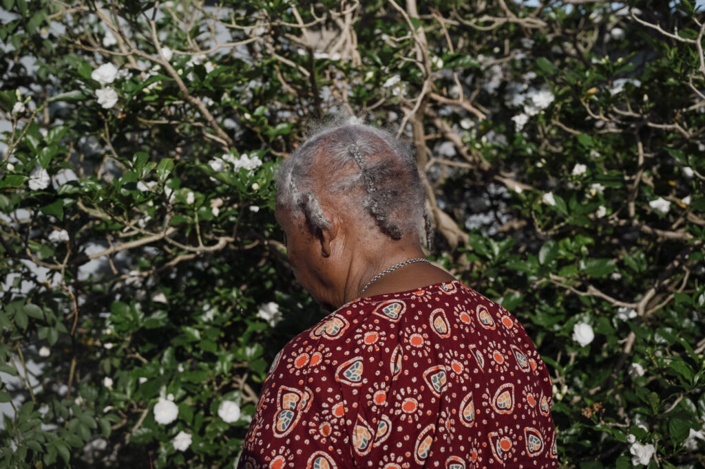 « Mami » pose devant un des arbres de son jardin. Depuis le cyclone, presque toutes les fleurs ont disparu, emportées par la pluie et les vents forts.