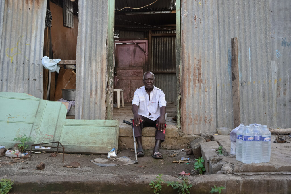 Devant sa maison ravagée par le cyclone, ce monsieur pose à côté du pack d’eau qui vient de lui être distribué.
