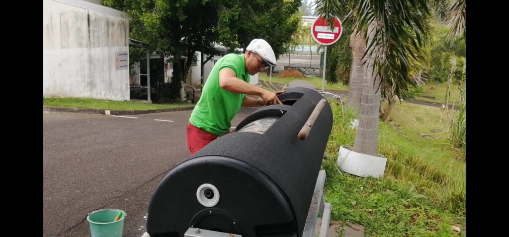 Au collège de la Marine Vincendo, la classe d’Ulis est référente pour le roule-roule. Le roule-roule, c’est le nom d’un compost rotatif, fabriqué à partir d’anciens chauffe-eau solaires arrivés en fin de vie. La cuve en inox est réutilisée, remise en service par la Casud. Chaque semaine, les équipes du collège introduisent dans un des deux bacs 20 à 25 kg de denrées alimentaires issues des restes de la cantine scolaire. Ils ajoutent à ça 10 à 15 kg de broyat. Les copeaux de bois vont absorber le surplus d’eau et vont permettre à la nourriture de se décomposer correctement. « Le problème que nous avons rencontré c’est que nous n’avions pas assez de broyat avec toute la pluie que nous avons eu ici », rapporte Myrose Berne, la conseillère principale d’éducation (CPE) de l’établissement.