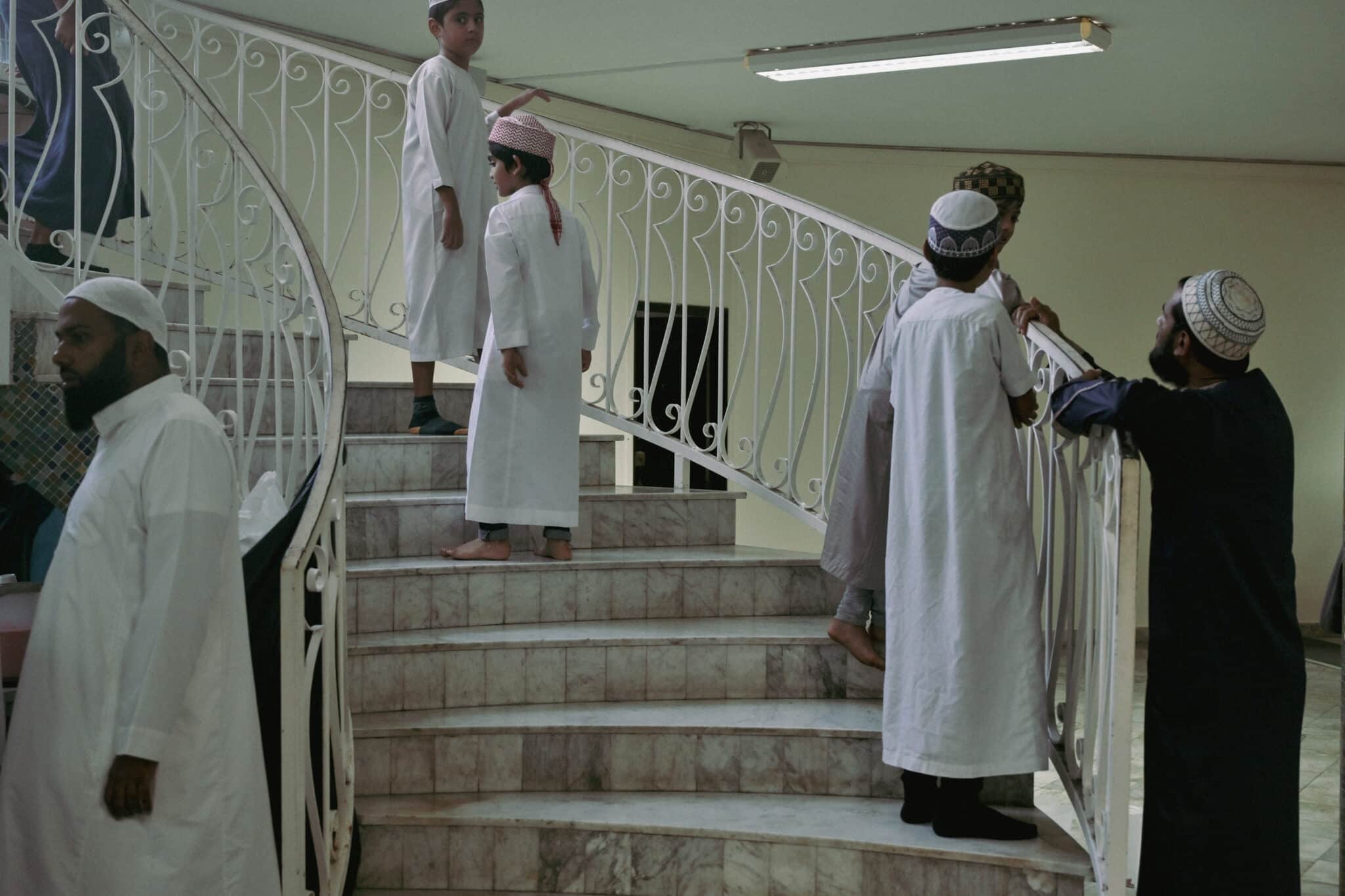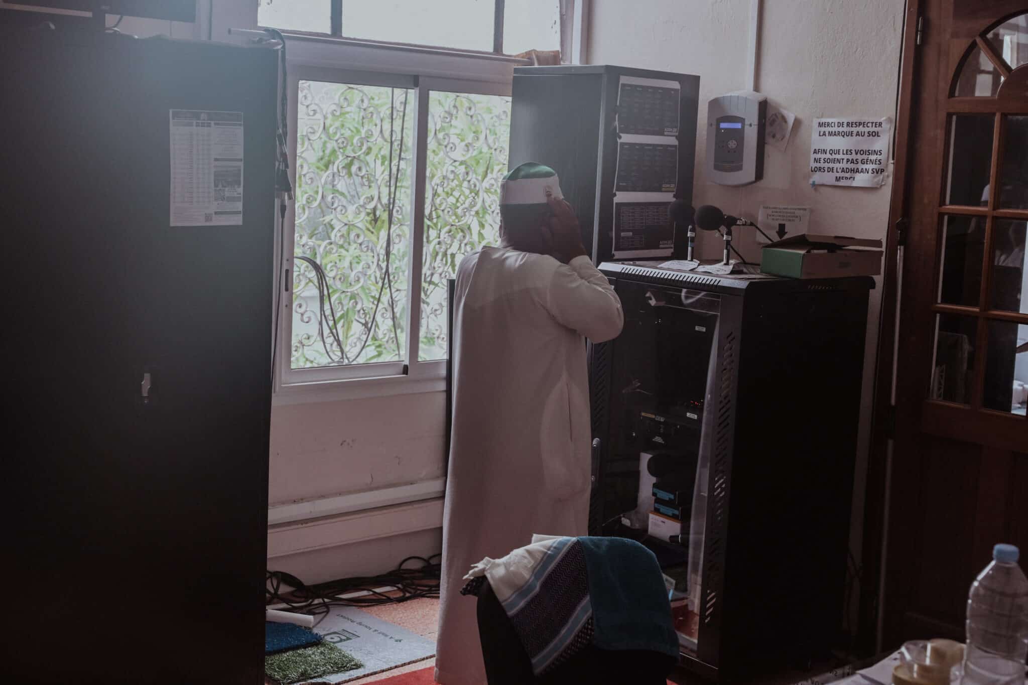 Un tableau indique les horaires des cinq prières de la journée. Il indique pendant le mois du ramadan le début et la fin du jeûne. Des fidèles discutent théologie et actualité à l’intérieur de la mosquée.