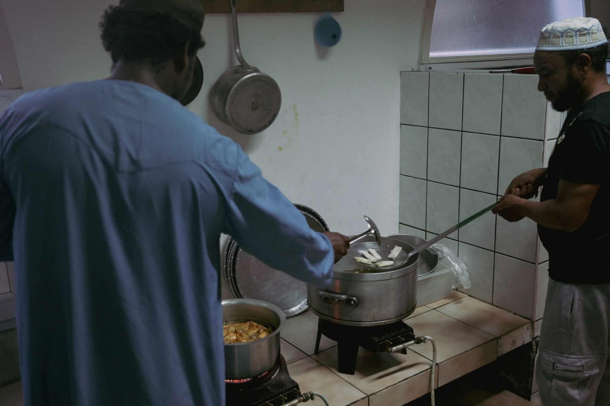 Dans les cuisines de la mosquée, on prépare des samoussas pour rompre le jeûne. Fidèles lors de la prière du Maghreb qui marque la fin du jeûne quotidien.