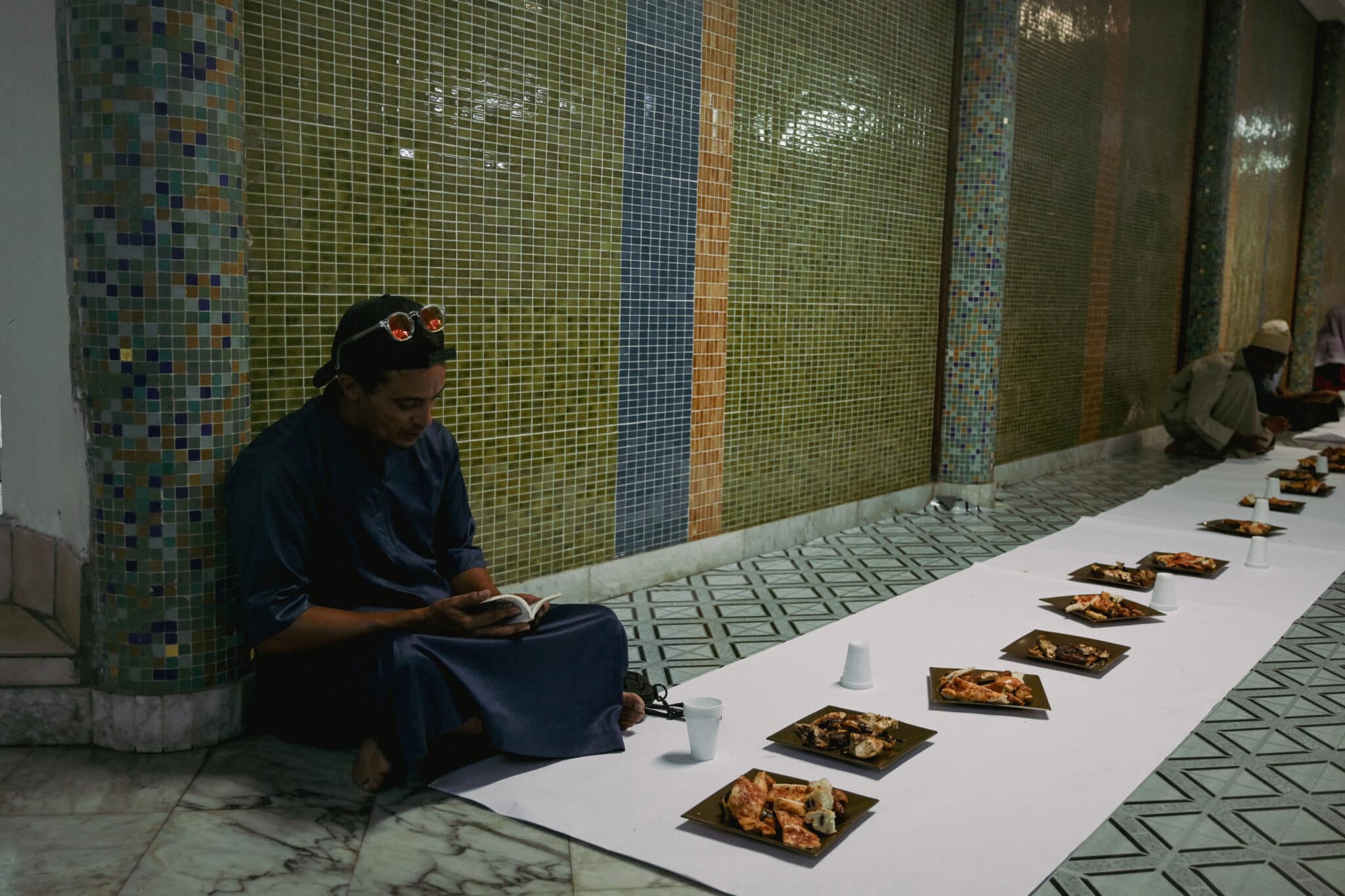 Lorsque le soleil disparaît derrière l’horizon, aux alentours de 18h45, les fidèles se rassemblent autour des nattes étendues sur le sol. Ils partagent un repas composé de dattes, de samoussas et de gâteaux avant de se réunir pour la prière du Maghreb, qui vient clôturer la journée de jeûne.