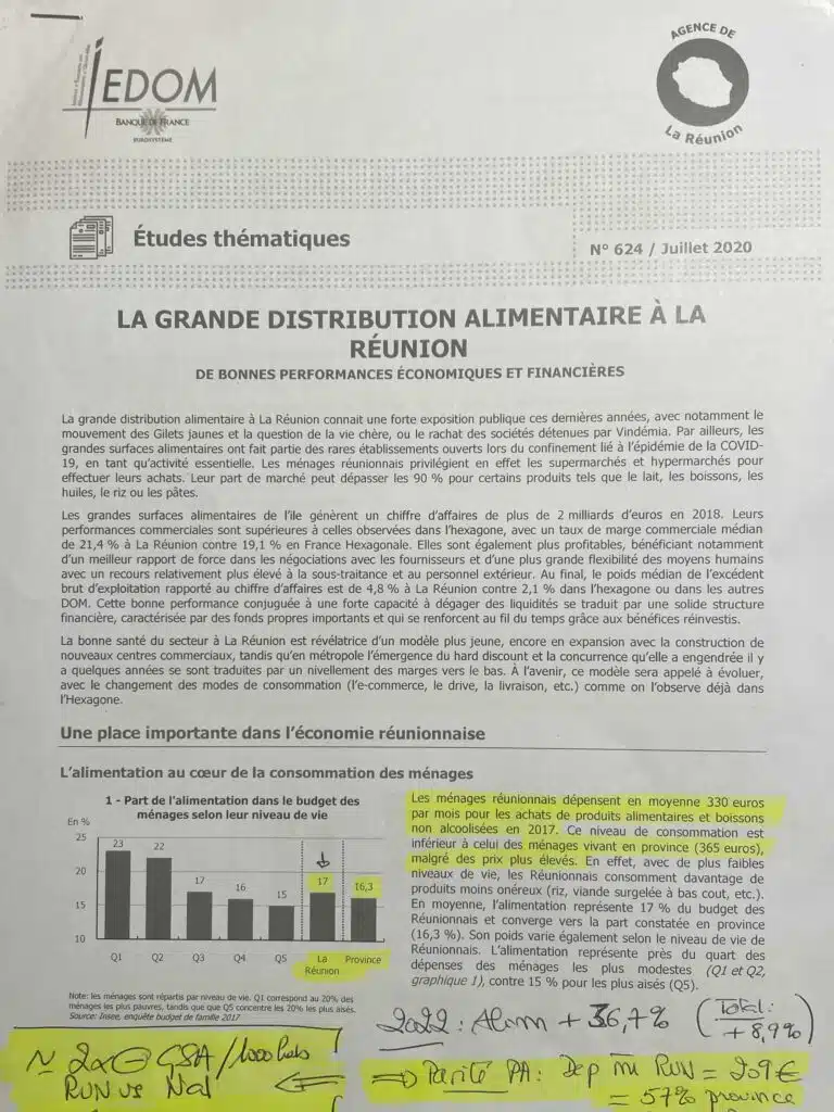 « Si on avait une baguette magique et qu’on pouvait obliger la distribution réunionnaise à faire les mêmes marges qu’en métropole, le bénéfice par ménage serait de 15 € à peu près. C’est pas avec ça qu’on va changer le 2 € par personne et par repas »