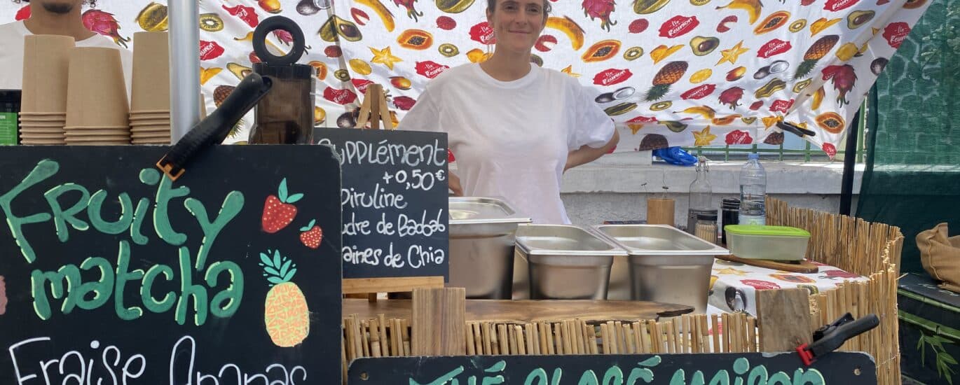 Claire vend des jus de fruits frais sur les marchés depuis 2019. Elle raconte les bienfaits de ses jus, et les associations dont elle est le plus fière.