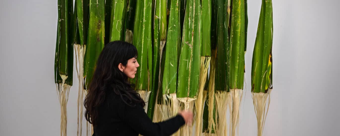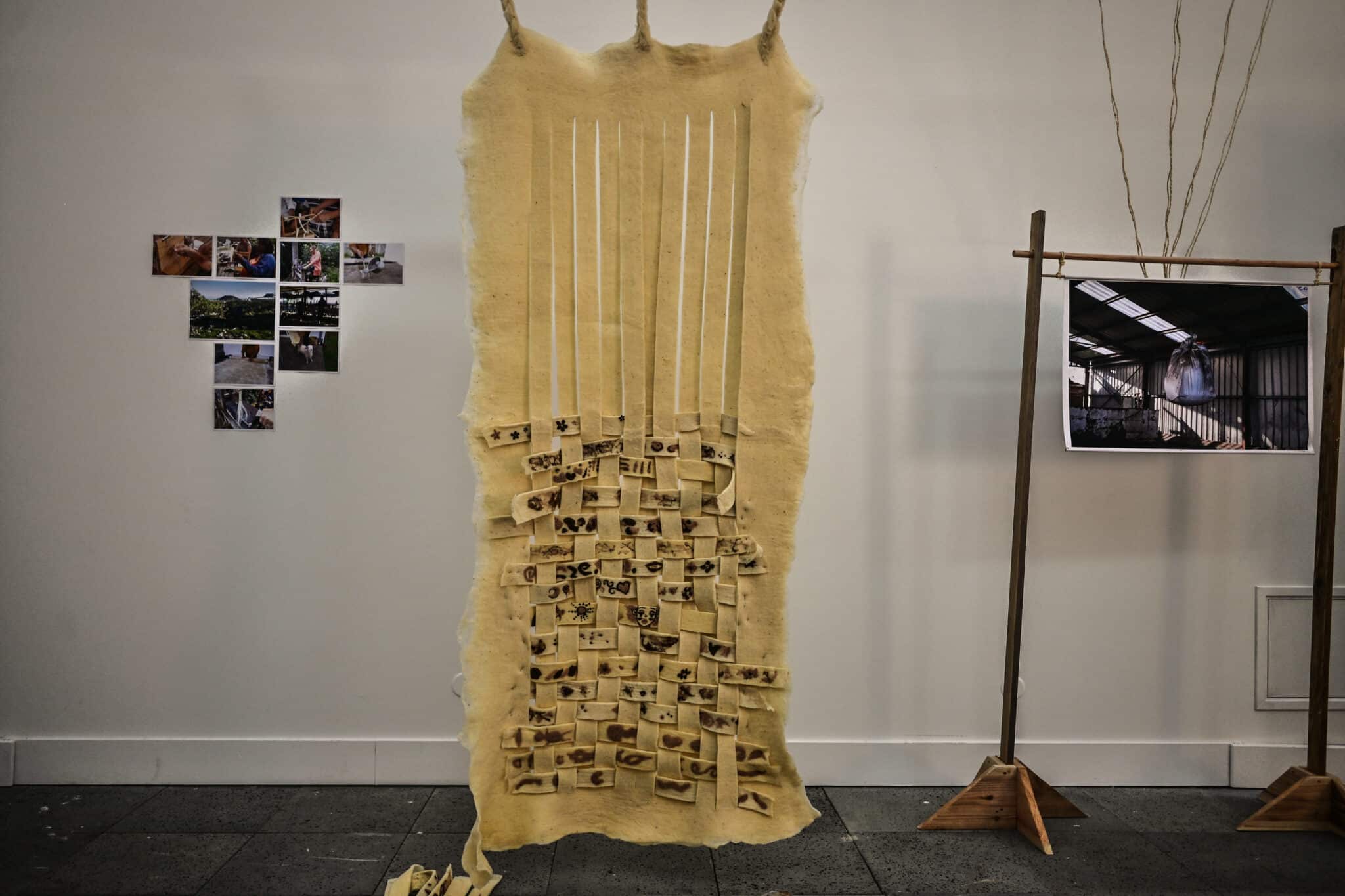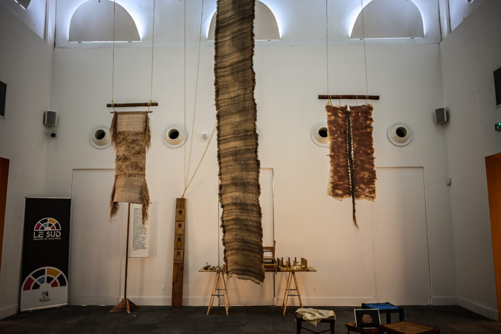Arpentisaz, contraction d’arpenter et de tisser, c’est l’acte de « parcourir le territoire en tirant les fils d’une filière (textile) qui émerge petit à petit. » Voici les mots d’Amanda Goicovic que l’on peut lire au début de son exposition-chantier dévoilée lors des journées du patrimoine au centre culturel Le Sud, à Saint-Pierre. Le titre de l’exposition dans laquelle l’artiste restitue ses six mois de résidence, exprime pleinement son engagement et sa réflexion.