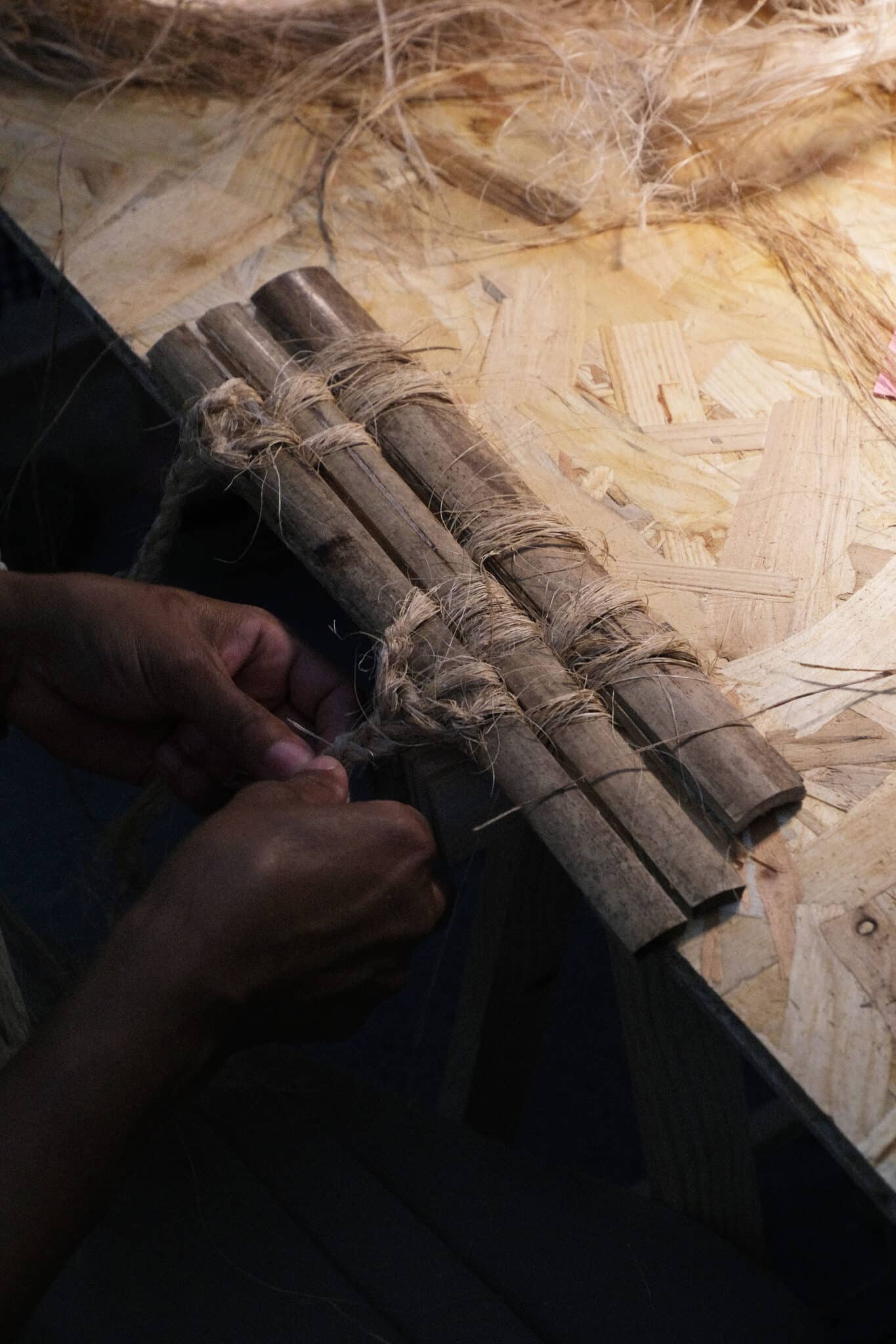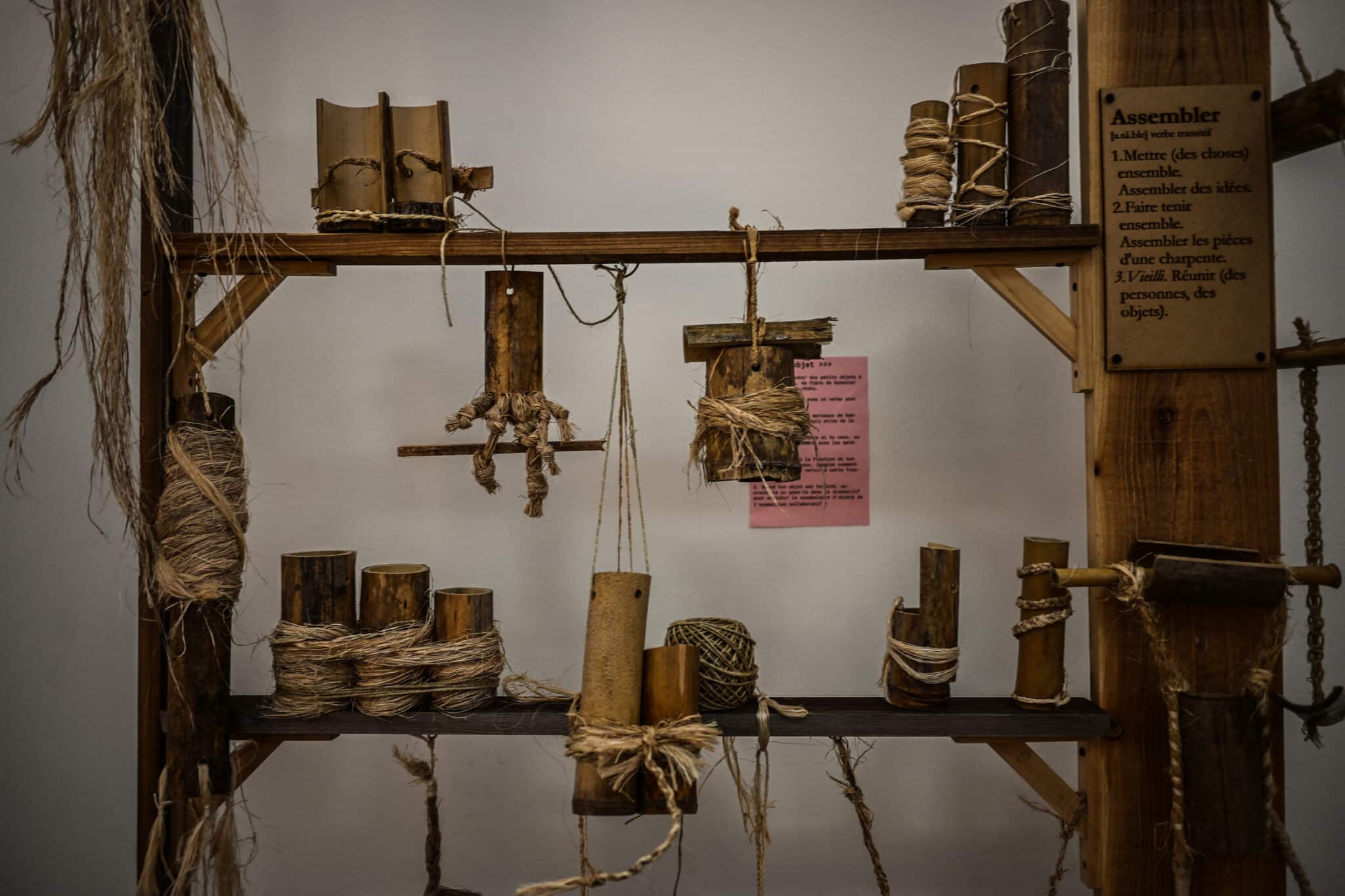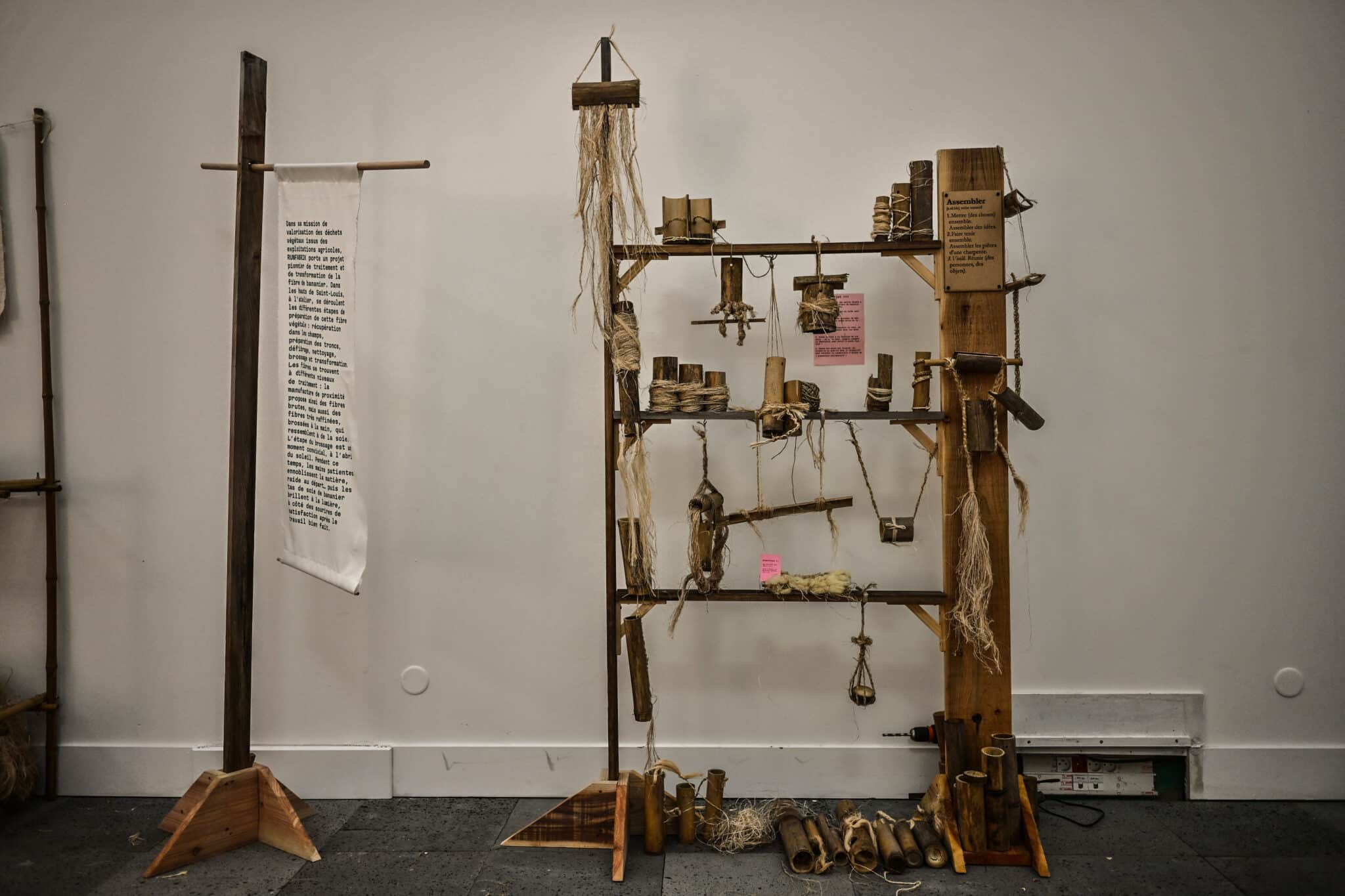 Les participants aux ateliers peuvent récupérer ici des fibres de bananiers.Chaque nouvelle création vient s’ajouter là et fait partie intégrante de l’expo-chantier.