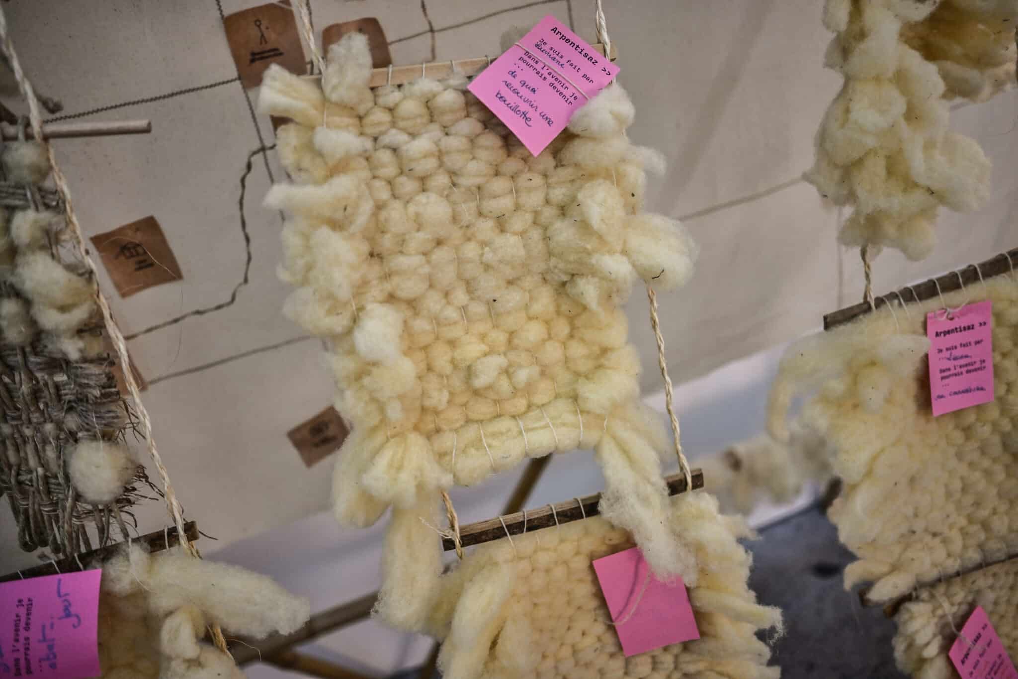 Travaux réalisés lors de l’atelier fabrication d’objets à partir de matériau locaux. Travaux réalisés lors de l’atelier d’initiation au tissage avec de la laine feutrée.