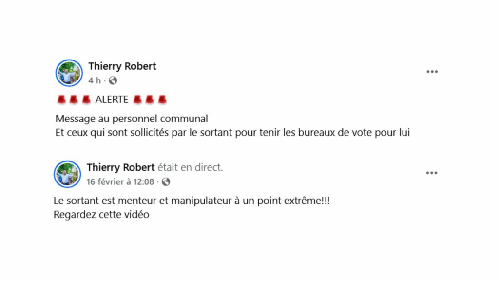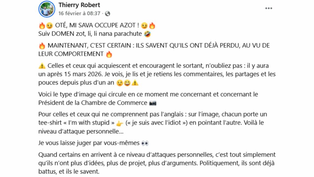 En calculant les vues (du 01 au 16 février 2026) sur Facebook de Thierry Robert, son canal de diffusion principal, le candidat cumule plus de 2 millions de vues sur environ 90 vidéos. Parmi ces 90 vidéos, on observe principalement Thierry Robert parler seul face à son téléphone, parfois pendant près de 20 minutes. Récemment, le candidat s’est affiché aux cotés de son frère Pierrick Robert, président de la chambre de commerce, dans un live de 40 minutes. Sous les vidéos postées, le candidat aux 74 000 followers utilise des titres sensationnels avec l’emploi d’émojis pour capter l’attention des Saint-Leusiens et Saint-Leusiennes, et par la même occasion celle de toute La Réunion. Interrogé, l’ex-maire dit qu’il ne s’attendait pas à de telles statistiques et déclare : « Maintenant je ne suis plus simplement politique, je suis maintenant un politicien-influenceur ».