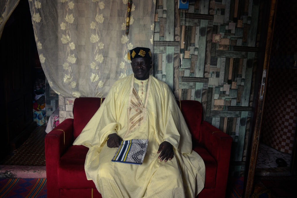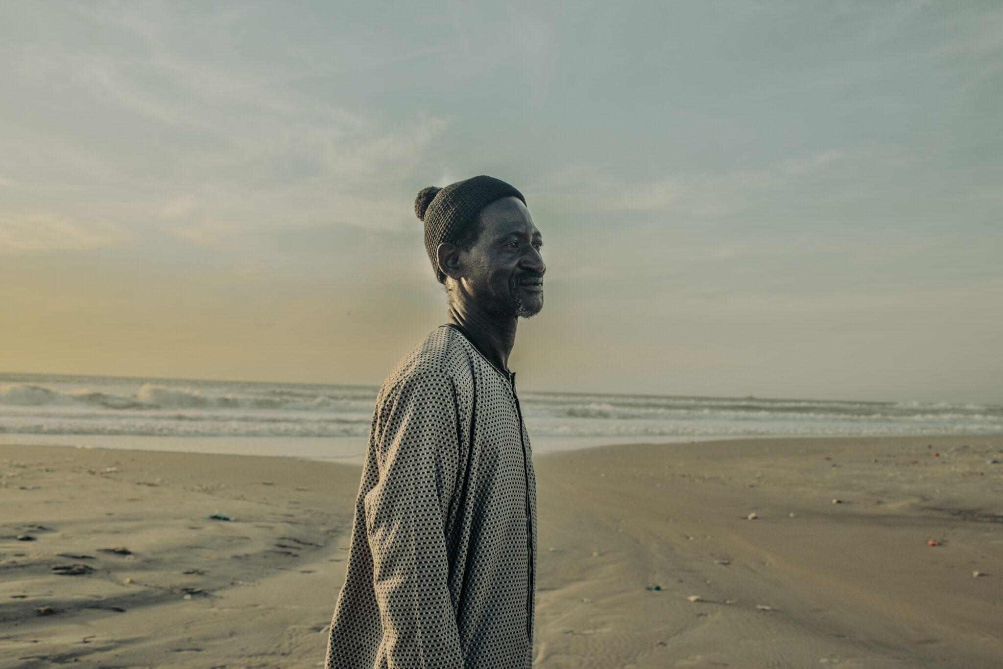Bara Ba contemple l’océan lorsque je le rencontre sur la plage. Assis sur une pirogue, il fait partie de ceux qui ont dû quitter leur ancienne maison à cause de la montée des eaux. Depuis 2018, il a été obligé de se déplacer avec sa famille dans un nouveau quartier construit à la va-vite pour héberger les pêcheurs. Chaque jour, il se lève avant l’aube pour venir jusqu’à Guet Ndar soit pour partir en mer soit pour simplement retrouver son quartier et participer à la vie collective du village.