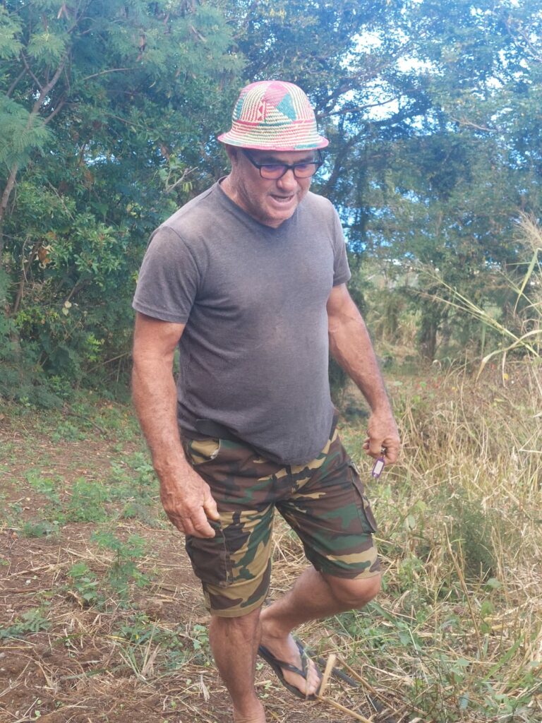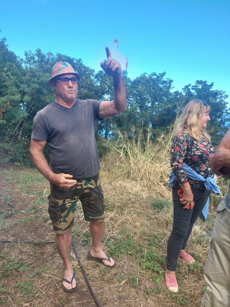 Là, de pied ferme et le chapeau sur la tête, Olivier Payet attend ses visiteurs pour l’exploration de deux hectares de bananiers où chaque plant est prétexte à des petites anecdotes locales ou échanges d’actualité…au gré des conversations improvisées du groupe. Oui cet agriculteur est un passionné, non seulement de sa terre, mais aussi d’histoire et de cultures de son île, et il ne tarit pas de gentilles petites provocations du coin de l’œil malicieux.
