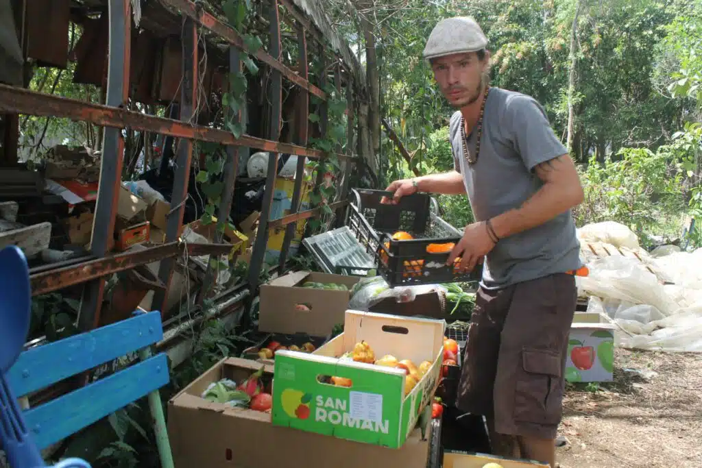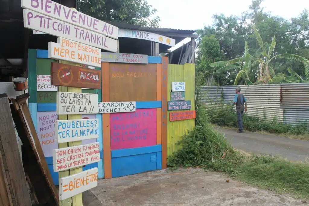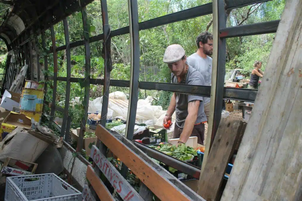 Tous les mardis, le tri se fait au Pti coin trankil, situé à la Ravine des Cabris. Jacky de l’association Germin’acteurs, Pat et plusieurs autres personnes régulières tiennent ce lieu qu’ils ont entièrement nettoyé depuis deux ans des déchets et carcasses de voitures qui s’y trouvaient. L’endroit est destiné, entre autres activités foisonnantes, à la culture, au recyclage, à la revalorisation des biodéchets. C’est aussi un lieu de partage avec des repas collectifs au moins deux fois par semaine. A l’entrée, quatre composts sont en fabrication pour pouvoir mieux traiter les restes issus du tri de légumes. En échange de prêter leur lieu, et dans une dynamique d’entraide, l’association Flag leur laisse une ou deux caisses de légumes.