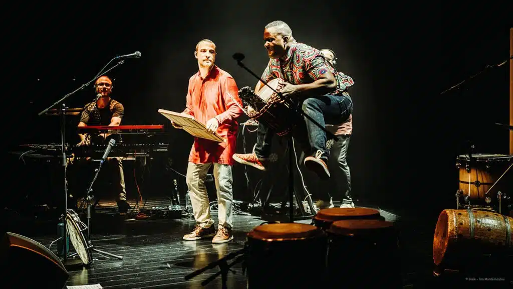 Premier invité à se dessiner en ombre chinoise en fond de scène : Bernard Joron que le public devine et appelle à cor et à cri quand il répond à Carlo sur le second couplet de “Zènés”. Une ode à nos marmailles, l’avenir de La Réunion, qui n’est pas sans faire écho au titre « Tous les enfants » d’Ousanousava justement…