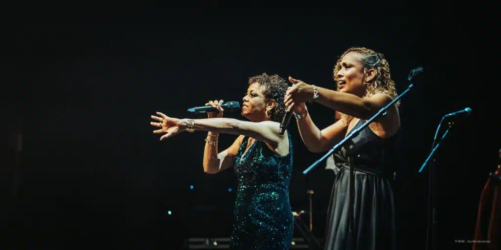 C’est donc tout naturellement que Laurence Albac, la fille du couple, qui assure les chœurs depuis le début du concert, avance sur scène avec sa guitare pour une interprétation solo acoustique poignante et inspirée de « désordre la ville » avant de le poursuivre cette interprétation avec sa maman et toute l’orchestration… « Et puis ma écout’ le vent, siffle dan mon zoreil, fré fré Fré ma frissonne un peu »… Comme tout le public qui à partir de ce moment est debout, danse et chante pour « Crasé salle verte », le premier tube de Michou signé Narmine Ducap et enregistré avec le groupe les Dièses. Un titre qui lui vaut le surnom de « petite fiancée des réunionnais » qu’elle garde encore aujourd’hui dans nos cœurs.