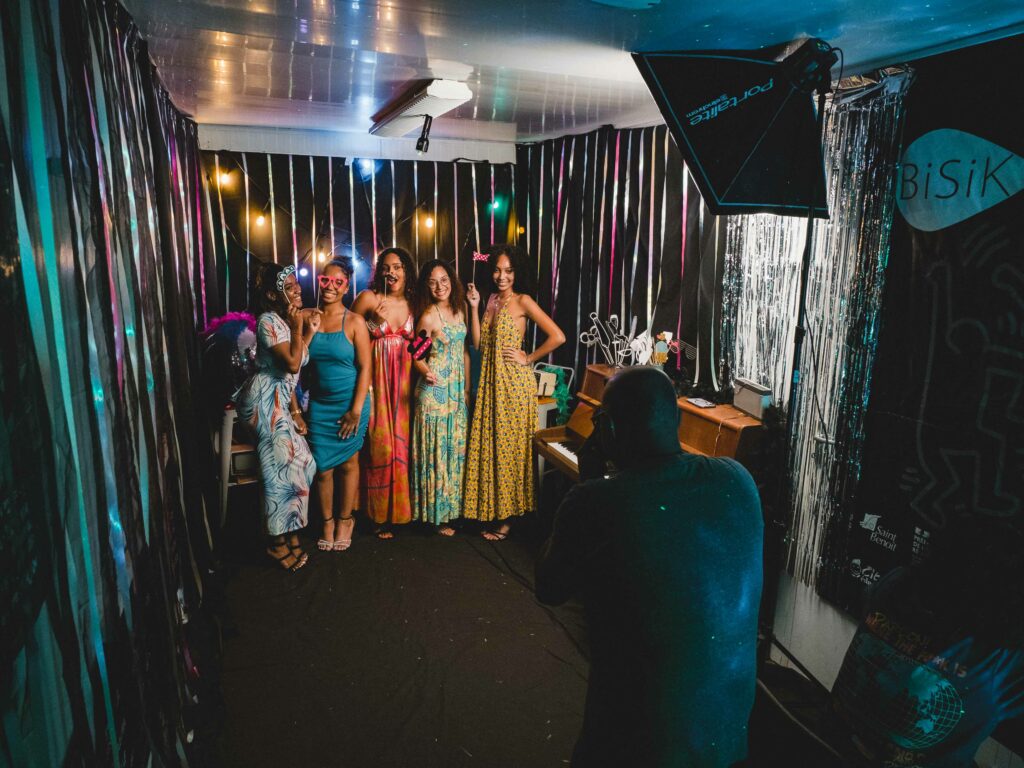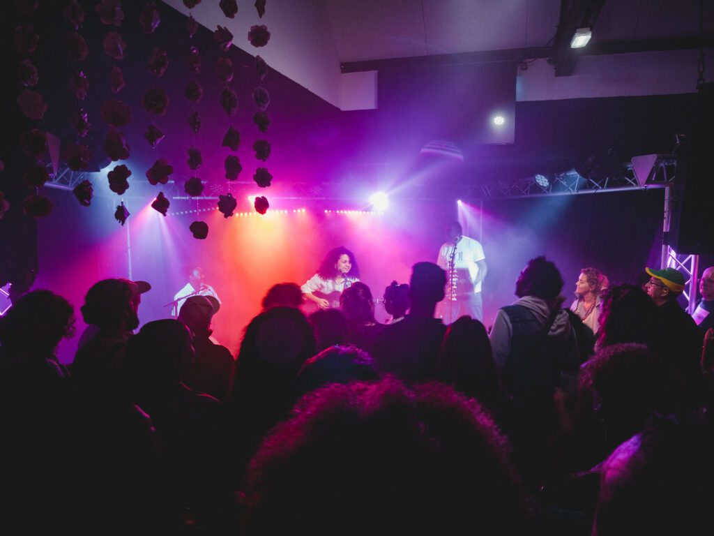 Le temps de partager des discussions animées, quelques retrouvailles émouvantes et de beaux moments entre amis, les spectateurs ont aussi, pour certains en tout cas, profité de « landrwa kashèt », pièces secrète du Bisik où un studio photo éphémère avait été installé par Fanal Fotogafi et toute l’équipe du Bisik sous la houlette de Frédéric Pothin, auteur photographe, et Lucie Admeth, étudiante à Studio M. De merveilleux moments capturés et des souvenirs inoubliables que vous avez pu découvrir sur notre page Facebook quasi instantanément pour notre plus grand plaisir. Koté musique, c’est sur la scène intérieure que Julie Anne et ses musiciens, Jean-François Carpaye et Luciano Alcimédon, prennent le relais. Portée par une exaltation communicative, cette jeune artiste prometteuse a su envoûter le public dès les premières notes, captivant la salle par sa présence scénique et sa voix envoûtante. Chaque morceau est un véritable voyage, et le public, suspendu à ses notes, ne s’est pas fait prier pour prendre le large en sa compagnie…