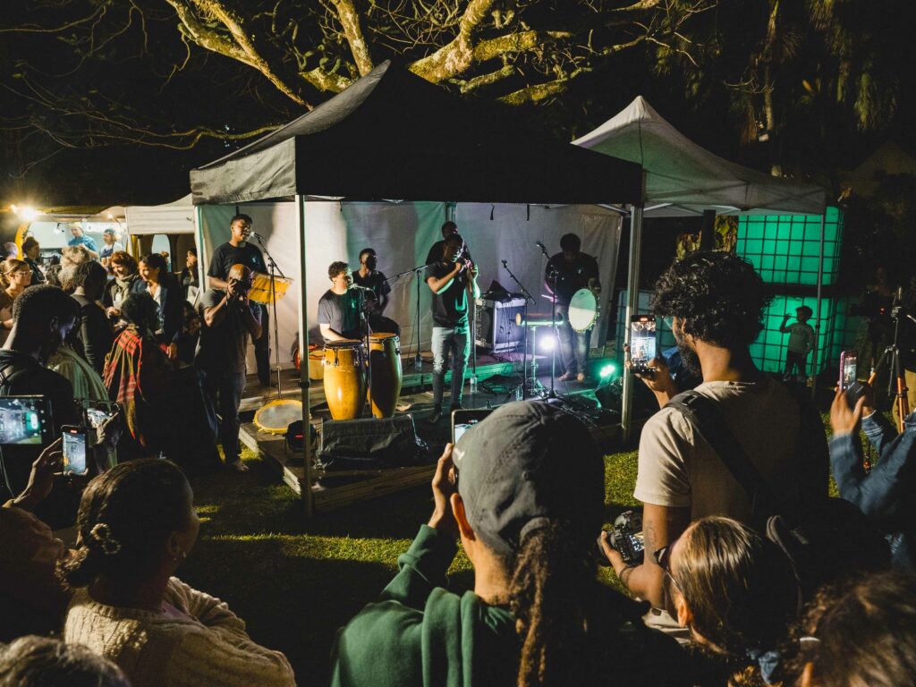 Après une série de discours inauguraux marqués par l’enthousiasme et la promesse d’une saison exceptionnelle, la soirée a véritablement pris son envol au rythme du maloya. Les premiers à fouler la scène installée koté jardin sont en effet les jeunes artistes de Zanfan Gayar, un groupe de Saint-Benoît, finaliste du Son du Bahut 2024 et digne héritier des plus grands noms du maloya de la ville, qui a littéralement électrisé l’audience koté jardin avec un maloya endiablé. Leur énergie contagieuse a d’emblée donné le ton d’une soirée 100% marsouins que n’a jamais démenti l’ardeur de l’engagement des artistes, du public, de notre équipe et de nos partenaires pour faire vivre la culture dans notre beau pays.