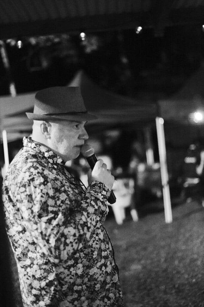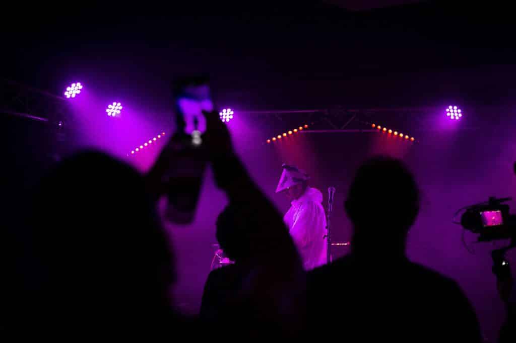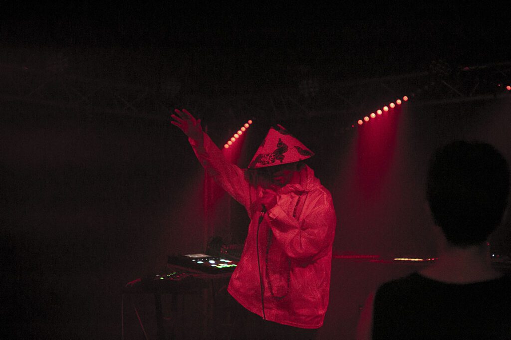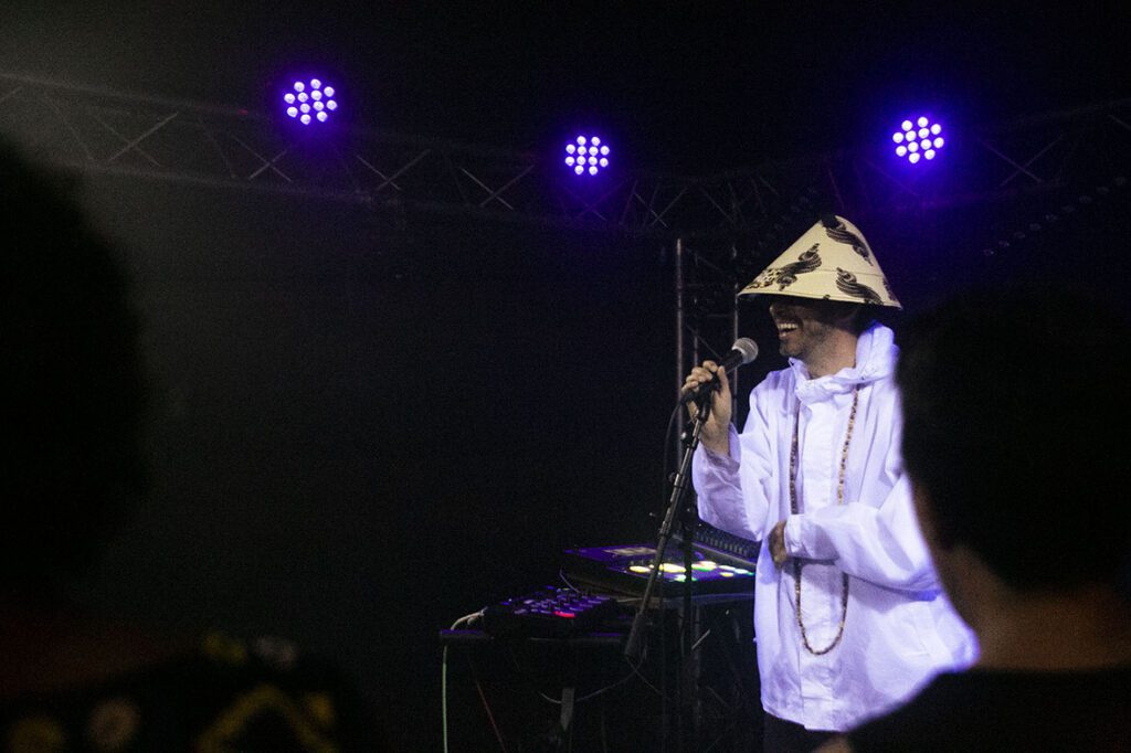 Après un bref changement de plateau, place maintenant au maloya-afro-futuriste en compagnie de l’artiste pluridisciplinaire Insula qui nous dévoilera sa créature métissée, “TRMBA”, qui résonne de facto avec notre époque cosmopolite, album paru en décembre 2022. Une première pour l’artiste qui officiait auparavant en tant que dj. C’est sous un enchaînement de flashs stroboscopiques que Micke entre en scène avec “Kabary”, une entrée dans son monde, comme une chute dégringolante dans son univers. “En diab” et “Bondié Maloubary” mène le public transcendé sur une danse tribale entre maloya et musique hindouiste avec son jeu de bobre envoûtant et l’intégration de tambours malbars et de chant tamoul. Entre deux morceaux, Insula a concocté une belle surprise, un “ti kado” ingénieusement préparé avec une réédition de “Kabar Gayar” de son ami Aleksand Saya. Le public est ravi et dansant, proche de la transe pour certains en harmonie avec le virtuose des machines électroniques aux commandes de “Spiritual Insularity” et “Tromba”. Un final avec un “Kaloubadia” entre battements saleg, roulements maloya électrisés.