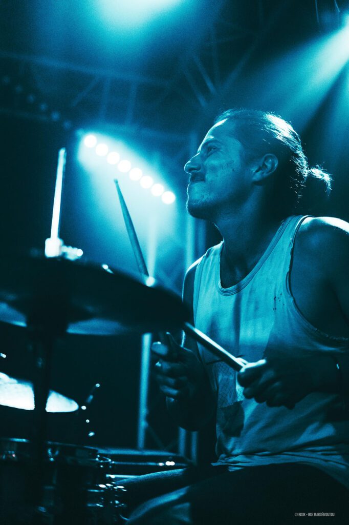 Le temps d’un changement de plateau rondement mené, et la soirée se poursuit en compagnie de Sly Sugar, bien décidé à enflammer le Bisik. Chris Haga au chant et aux percussions, Sylvain Balme aux claviers et au chant et deux nouveaux venus, Jordan Fontaine à la batterie et Martial Combeau à la basse nous entraînent dans les sillons sinueux de leur premier album L’opium du peuple tant attendu et sorti en 2022.