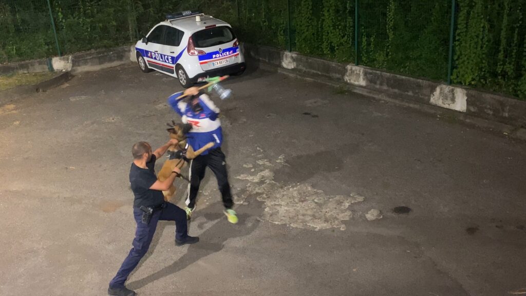 Dans ce chenil, tous les chiens sont des malinois. Souvent, ils sont sauvés par la SPA puis recrutés par le Centre national de formation des unités cynotechniques (CNFUC) de Cannes-Ecluse en Seine-et-Marne qui teste leurs aptitudes. « Ce sont des chiens qui sont souvent destinés à être piqués, la police leur offre une seconde chance. » nous explique Vincent, le brigadier-chef de l’unité canine du commissariat du Chaudron, seule unité canine de la police nationale à La Réunion. Ces chiens sont des armes létales, des sportifs de haut niveau qui nécessitent des entrainements réguliers. Ils ne sont ni castrés, ni sociabilisés afin de conserver tout leur instinct de prédation. Ce soir-là, c’est Paco qui est entraîné, la dernière recrue. Un entrainement haut en couleurs, « on va faire du théâtre » nous explique Jérémy, gardien de la paix et conducteur de Paco. Deux rôles : l’homme d’attaque et le conducteur. « La priorité c’est que le chien ne se blesse pas » affirme le brigadier-chef qui joue le rôle d’hommes d’attaque ce soir. « Tout ça peut paraître violent mais pour le chien, c’est du sport et cela permet qu’il soit efficace sur la voie publique. » Le chien est entraîné à taper avec la muselière mais aussi à mordre l’homme d’attaque.