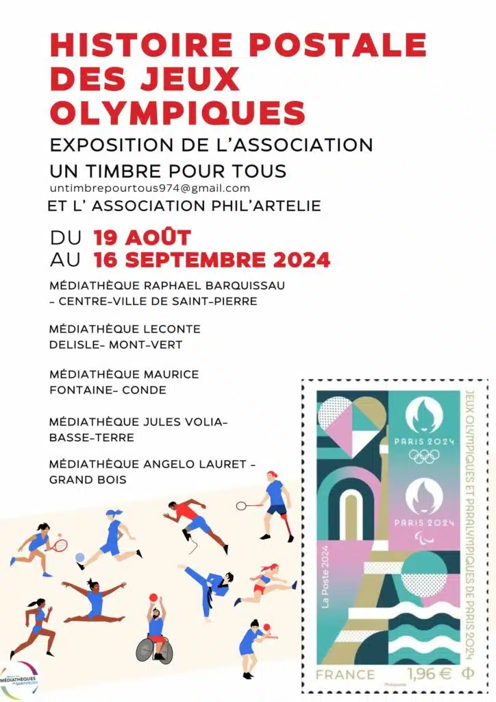 Les associations Un timbre pour tous et Phil’arthelie vous invitent à l’exposition ludique : Histoire postale des jeux olympiques. Découverte des jeux olympiques à travers l’histoire  par les  plus petits voyageurs du monde entier : les timbres. Du 20 août  au 16 septembre 2024 dans les médiathèques de Saint-Pierre. Médiation le 20 août et tous les  mercredis après midi de 14h-16h dans  la médiathèque du centre ville. Animation…
