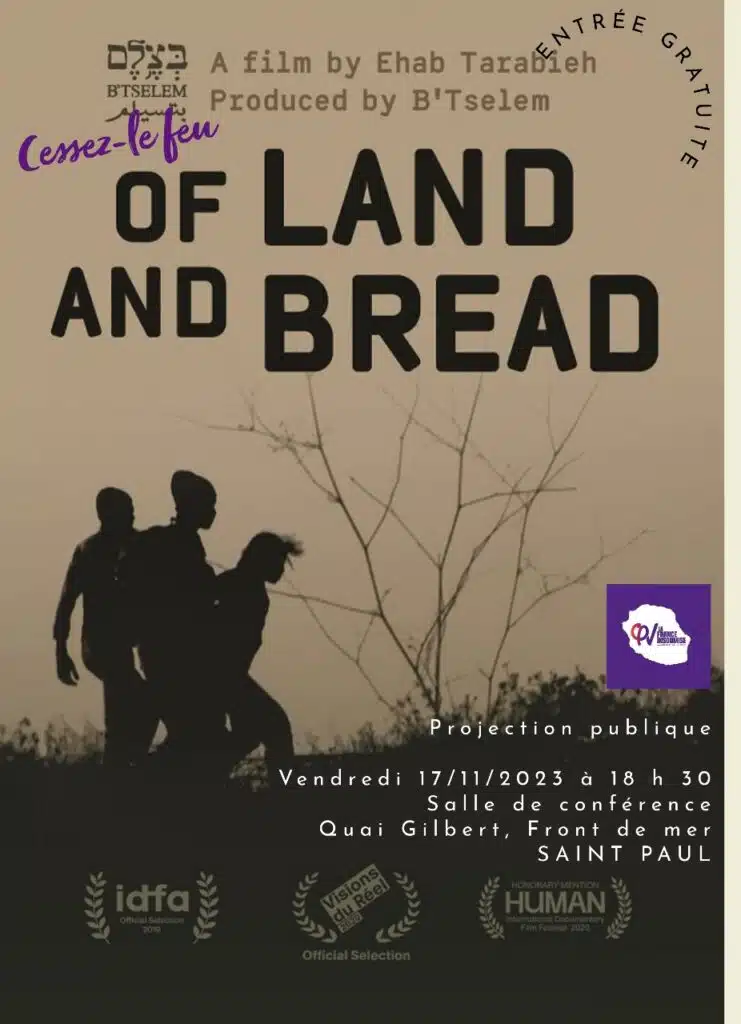 LIBRE EXPRESSION L’association Attac organise la projection publique à 18h30 du film israélien Of Land and bread sur la situation des Palestiniens en Cisjordanie le vendredi 17 novembre salle de conférence du Quai Gilbert, sur le Front de mer de Saint-Paul. Résumé L’association de droits humains B’tselem, ONG israélienne, a lancé en 2007 un projet consistant à fournir des caméras vidéo et…